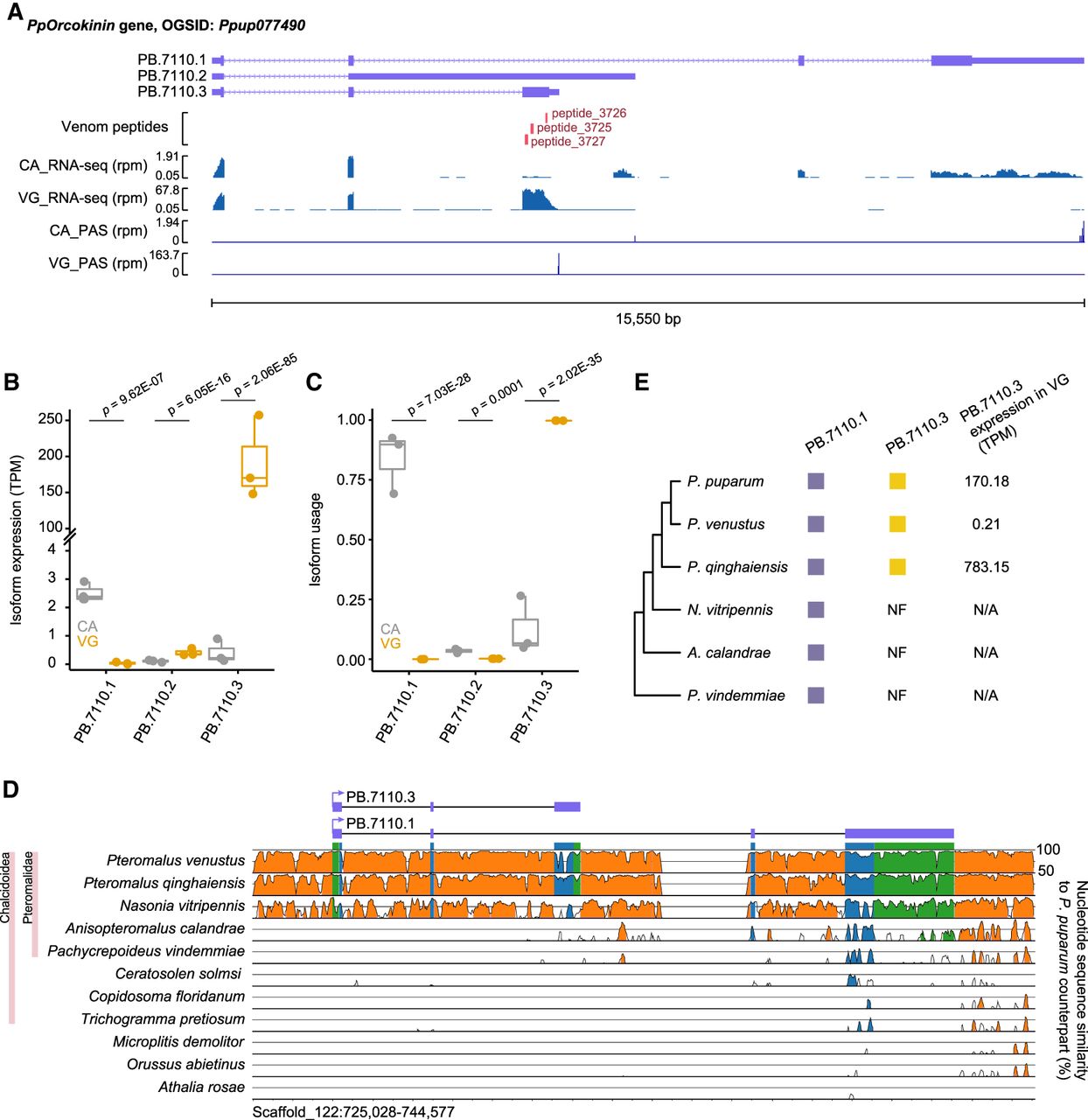 Evolutionary dynamics of the orcokinin gene and its venom isoform. (A) PpOrcokinin exhibits three isoforms (PB.7110.1, PB.7110.2, and PB.7110.3) expressed in the venom gland (VG) and carcass (CA). From top to bottom: isoforms, peptides supported by venom proteome, RNA-seq, and PAS-Seq. (rpm) reads per million. For supporting evidence of the venom PB.7110.3 protein, please refer to Supplemental Figure S26. (B) Expression levels of the three PpOrcokinin isoforms in VG and CA, displaying the adjusted P-values from the differential expression analysis conducted with DESeq2. (C) Isofrom usage of the three PpOrcokinin isoforms in VG and CA, showing the FDR (Benjamini–Hochberg) adjusted P-values from the differential isoform usage analysis. Isoform usage is calculated as expression of a specific isoform divided by the expression of the parent gene. (D) VISTA sequence conservation plot of the orcokinin gene in representative hymenopterans species, using P. puparum as the reference. Genomic sequences exhibiting over 50% sequence identity compared to the reference are depicted. Noncoding regions are indicated in orange, exons in blue, and UTRs in green. Conserved regions with at least 70% identity over a 100 bp window are shown in the corresponding color. The protein structures of two coding isoforms (PB.7110.1 and PB.7110.3) are displayed. A zoomed view of the exon3 alignment of PB.7110.3, including a specific DNA insertion in P. venustus, can be found in Supplemental Figure S27. (E) Schematic representation of orcokinin isoforms in six parasitoid wasps, presented to the right of the species tree. Filled boxes represent the presence of the corresponding isoform. (NF) not found. The isoform expression values (TPM) in VG are provided. (N/A) not applicable.