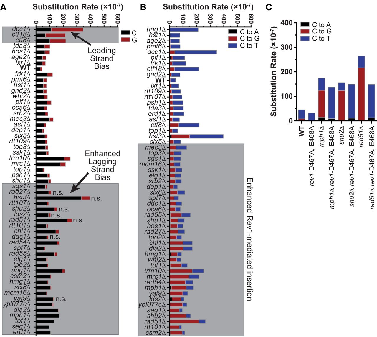 Spectra of A3B-induced mutations in CAN1. The CAN1 gene of independent CanR isolates was amplified and sequenced to determine the spectra of A3B-induced mutations in yeast with specific gene deletions. Note that A3B-induced CAN1 mutants were not sequenced from the aim9Δ, rnr4Δ, ser3Δ, swe1Δ, yap1802Δ, YKL136WΔ, and YHL042WΔ strains. (A) Strand bias of A3B-induced mutations in CAN1 is influenced by specific gene deletions. The rate of C (black bars) or G (red bars) substitutions in each genotype of yeast expressing A3B. Wild-type yeast expressing A3B favors C substitutions over G substitutions, indicating that the lagging strand template is the top DNA strand of CAN1 at its location on ChrV. The ratio of A3B-induced C-to-G substitutions in wild-type yeast was compared to the same ratio for each yeast deletion strain by two-sided Fisher's exact test. Genotypes with P-values < 0.00083 (based on Bonferroni multiple hypothesis testing correction) were considered to have altered strand bias. (B) The rates of C-to-A, C-to-T, and C-to-G substitutions (complementary substitutions were combined) in CAN1 for yeast expressing A3B and containing various gene deletions. The ratio of C-to-T and C-to-G substitutions were compared pairwise between wild-type yeast expressing A3B and each specific gene deletion strain by two-sided Fisher's exact test. Gene deletion strains displaying P-values < 0.00083 (for Bonferroni correction) were deemed to have more A3B-induced abasic sites bypassed via Rev1 catalytic activity. (C) Rates of C-to-A, C-to-T, and C-to-G substitutions (as in B) for comparing WT and recombination-deficient yeast with corresponding strains lacking Rev1 catalytic activity (i.e., rev1-D467A, E468A).
