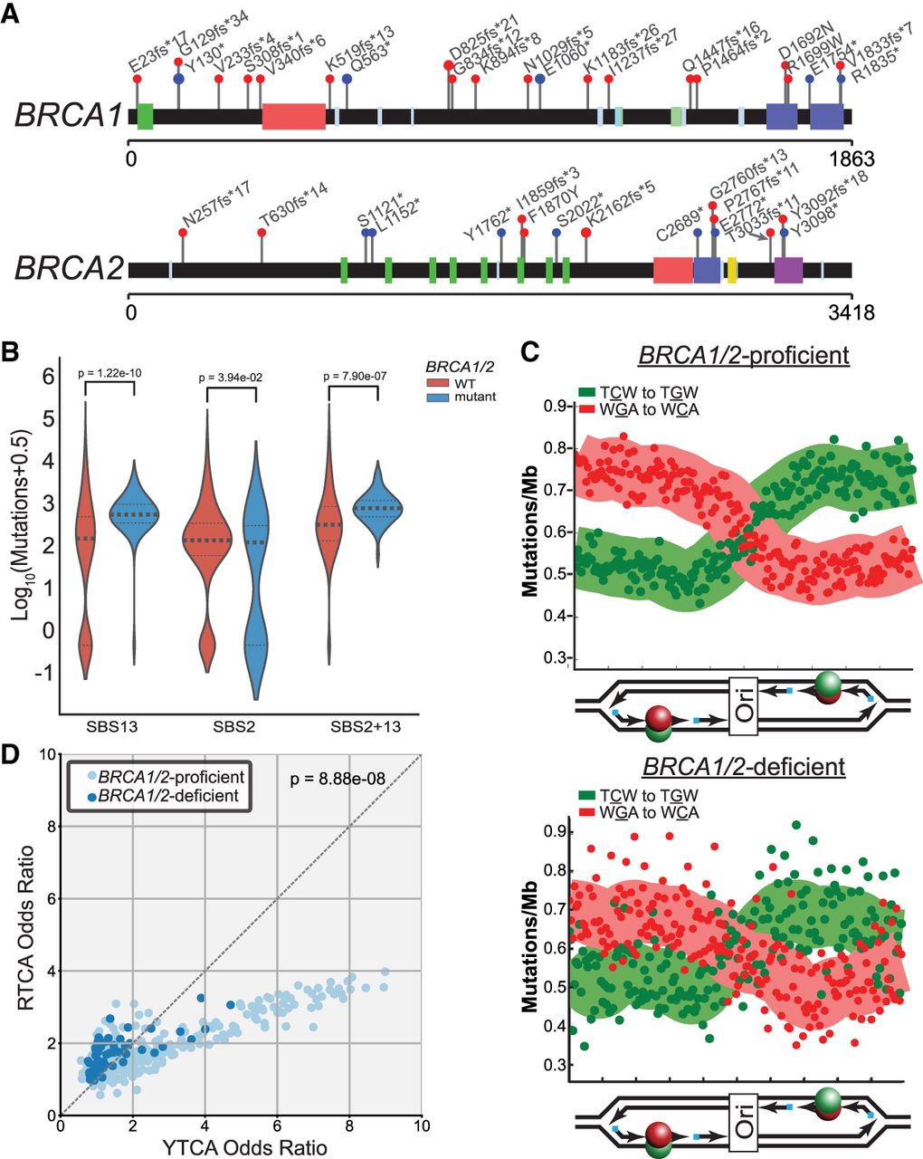 Recombination-deficient breast cancers have elevated APOBEC signature mutagenesis. (A) Position of germline mutations in BRCA1 and BRCA2 present in 560 breast cancers sequences as part of the International Cancer Genome Consortium. (B) Median estimated number of COSMIC SBS2, SBS13, and SBS2 + SBS13 mutations in breast cancers from BRCA-proficient and BRCA-mutant patients. (C) Replication strand bias of SBS13 mutations in tumors from BRCA-proficient and BRCA-deficient patients. (D) Enrichment of A3B-like (RTCA) and A3A-like (YTCA) signature mutations in BRCA-proficient and BRCA-deficient tumors. Increased representation of the A3B-like mutation signature compared with the A3A-like mutation signature among BRCA1/2-mutant tumors was assessed by chi-square test (P = 8.88 × 10−8).