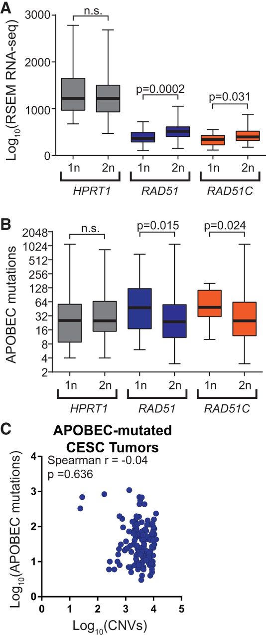 Impact of recombination gene haplo-insufficiency on APOBEC-induced mutagenesis in cervical cancers. (A) Median RSEM normalized RNA-seq expression values (middle horizontal bar in each box plot) for HPRT1, RAD51, and RAD51C in cervical cancers; one or two copies of each gene as determined by GISTIC analysis of SNP6 array data. Error bars indicate the range of RSEM expression values among tumors in each group. Tumors with two copies of RAD51 and RAD51C have higher expression of the respective genes than tumors with one copy as assessed by Mann–Whitney ranked sum test. (B) Minimal estimate of the number of APOBEC-induced mutations in cervical cancers with one or two copies of HPRT1, RAD51, and RAD51C. Median values are indicated by the middle bar in the box plots, and error bars indicate the range of values in each group. (C) Lack of correlation between the number of copy number variants (CNVs) and APOBEC-induced mutations in cervical cancers sequenced by TCGA. The Spearman's coefficient (rho) and P-value are indicated.