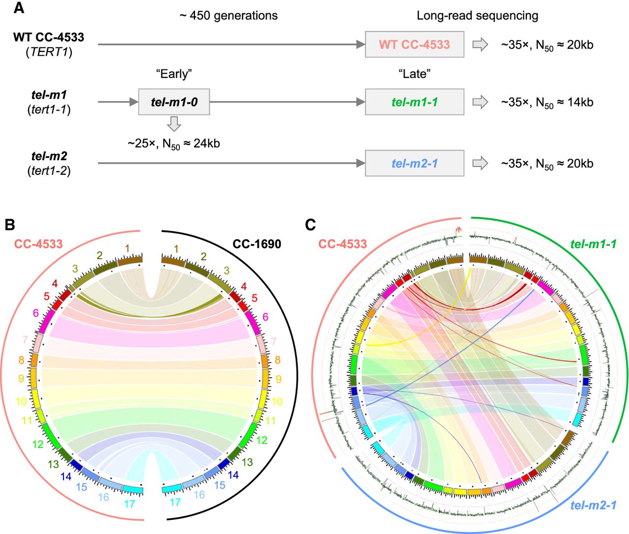 Independent genome assemblies of CC-4533 and telomerase-mutant strains tel-m1-1 and tel-m2-1 reveal few rearrangements at the genome assembly level. (A) Experimental setup and main sequencing output. (B,C) Circos plot (Krzywinski et al. 2009) of chromosome scaffolds from the long-term culture of CC-4533 compared with CC-1690 (B) and with tel-m1-1 and tel-m2-1 (C), shown as colored boxes, with black marks for centromere clusters (composed of the Zepp-L1 repeat). Links connect homologous blocks, colored according to CC-4533 chromosomes. Outer plot displays sequencing depth, averaged over 100-kb regions, with 0×, 35×, and 70× grid lines shown in black, green, and red, respectively. Depth over 50× is highlighted in red, and genomic position is indicated in megabases.