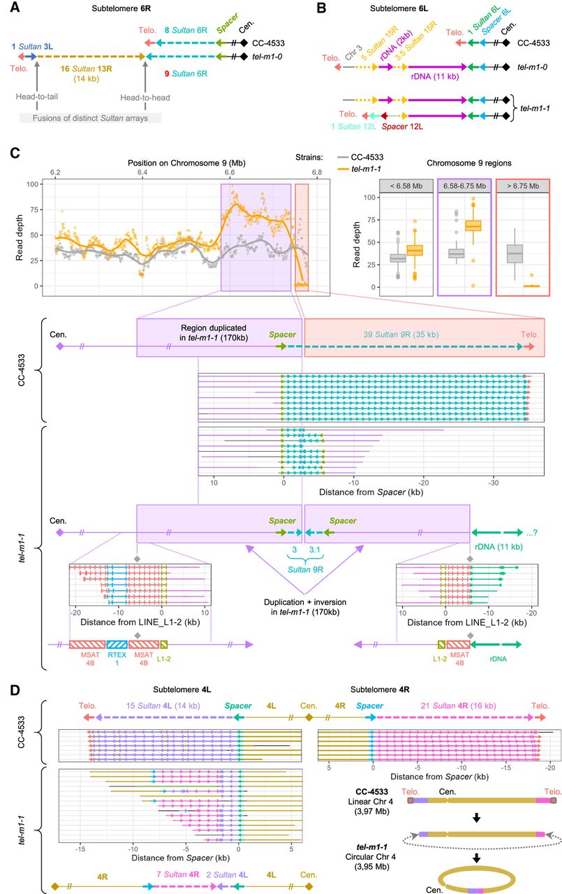 Complex genome rearrangements at subtelomeres. (A) Schematic representation of subtelomere 6R in which, in tel-m1-0, 2 additional Sultan arrays were fused to the initial Sultan array in inverted orientation. (B) Schematic representation of complex rearrangements at subtelomere 6L in tel-m1-0 and tel-m1-1, including Sultan elements from different subtelomeres and rDNA sequences. In tel-m1-1, two subpopulations of reads reveal two distinct structures stemming from the initial rearrangement found in tel-m1-0. (C) Signature of a BFB event at subtelomere 9R in tel-m1-1. (Top) Duplication of the last 170 kb of the chromosome end. Read depth is computed on the indicated regions of Chromosome 9. (Middle) Individual reads supporting the loss of telomeres and 36 Sultan elements, as well as the end-to-end fusion of the 9R sister chromatids. (Bottom) Reads showing the recruitment of >11 kb of rDNA sequences at the new 9R extremity, disrupting an array of MSAT-4B satellite sequences. (D) Representation of reads supporting the fusion of subtelomeres 4L and 4R in tel-m1-1, after complete loss of telomeres and a total of 27 Sultan elements. (Bottom right) Scheme of the inferred circularization of Chromosome 4, also supported by de novo genome assembly (Supplemental Fig. S6E,F). Black segments correspond to sequences that are not aligned to any of the selected queries.