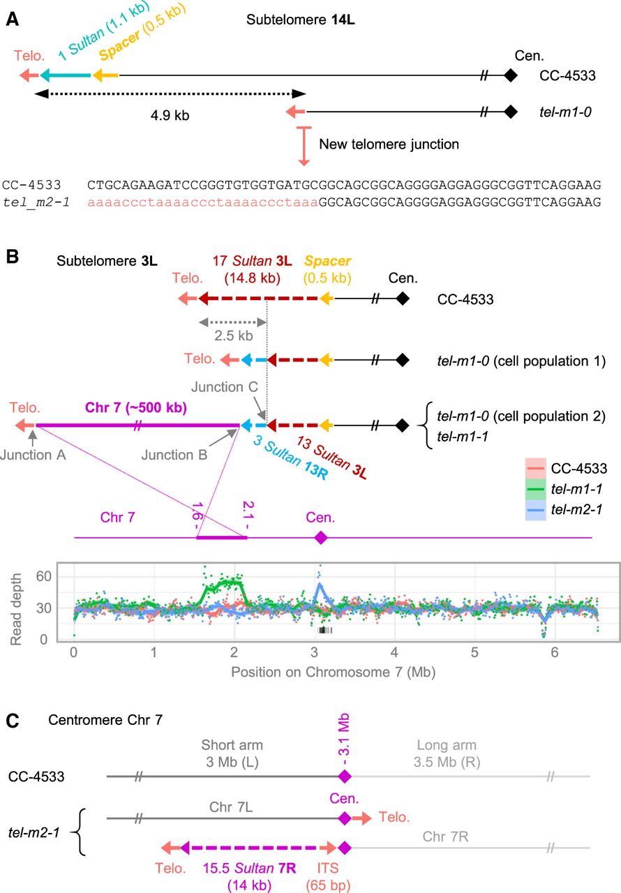 New extremities without canonical subtelomeric elements. (A) Scheme of the loss of 4.9 kb of sequence and formation of a new telomere at subtelomere 14L of tel-m2-1. The new junction sequence is shown. (B) Scheme of the complex new 3L extremity in tel-m1-0 and tel-m1-1. The sequencing depth for Chromosome 7 is shown, revealing the duplicated 500-kb region in tel-m1-1. The sequences of Junction A, B, and C are shown in Supplemental Figure S7, A through C. (C) Scheme of the Robertsonian fission that occurred on Chromosome 7 of tel-m2-1. The new centromere-proximal extremities were stabilized by telomere sequences, with in addition a Sultan array and an ITS for the 7R long arm.