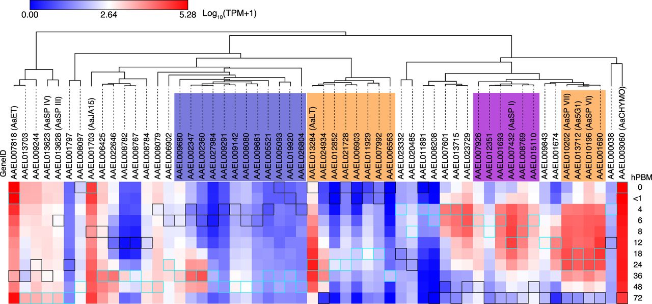 Expression patterns of SPs with 1.5 < log10 (TPM + 1) at least one time point. Genes were hierarchically clustered by expression patterns. Maximum and minimum values across the time course are indicated by cyan and black squares, respectively. For the groups indicated by colored shadings, see text.