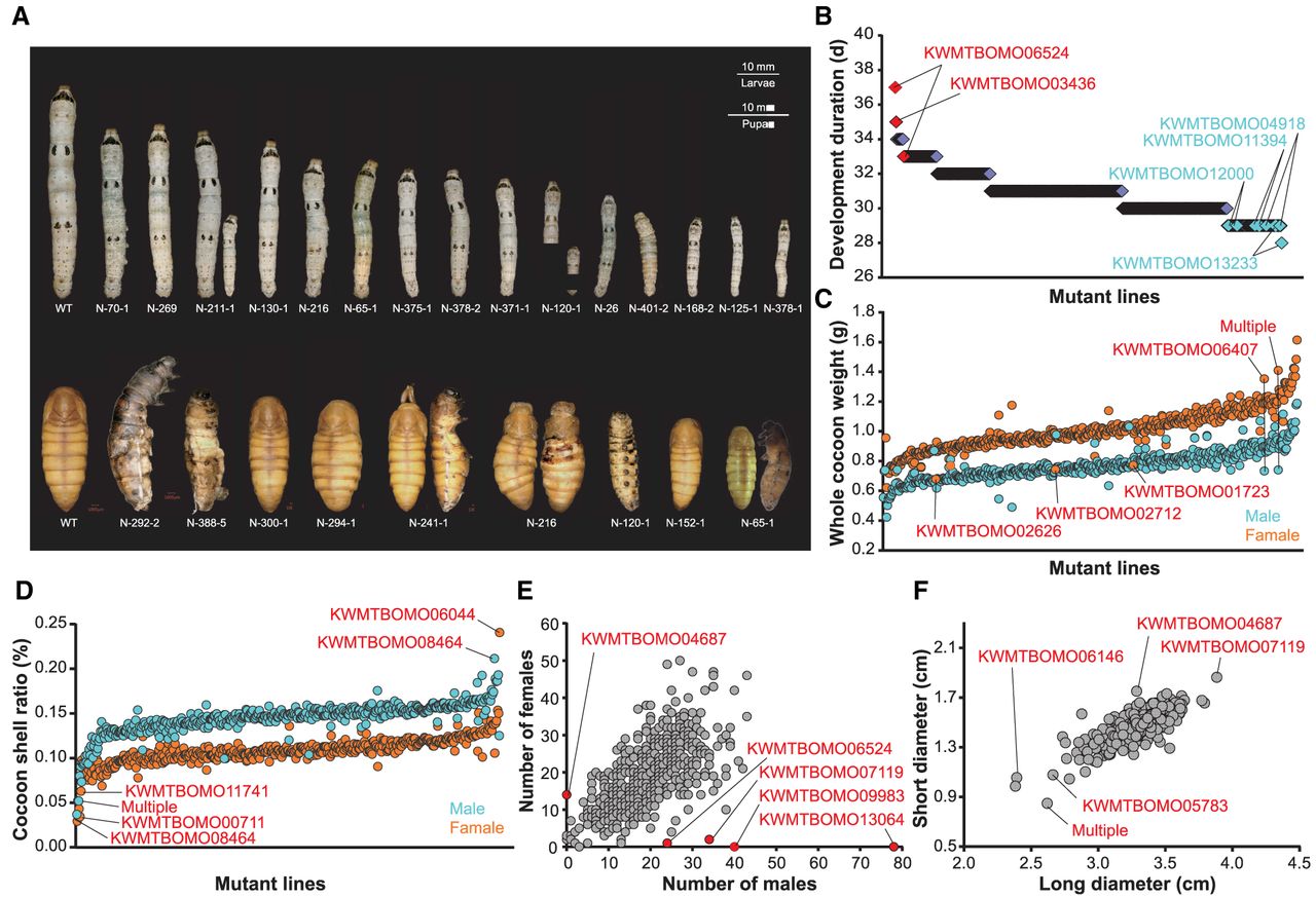 Phenotypic characterization of the mutant library. (A) The body sizes, epidermal coloring, developmental duration, speckle patterns, appendage development, and metamorphosis arrest of 33 F1 lines. These 33 F1 strains showed significant morphological differences among the 300 F1 strains. (B) The development duration of different mutant lines. The genes that may be associated with development extending are highlighted by red; those in light blue are more possibly associated with a shortened development. (C) The whole cocoon weight of different mutant lines. The genes possibly associated with whole cocoon weight improvement are highlighted by red. Each blot represents the average cocoon weight of 50 individuals. (D) The cocoon shell ratio of different mutant lines. The genes possibly associated with cocoon shell ratio improvement are highlighted by red. Each blot represents the average cocoon shell ratio of 50 individuals. (E) The number of males and females in each line. The genes possibly associated with sex differentiation of silkworm are highlighted by red. (F) The short and long diameter of cocoon in each line. The genes that may regulate spinning behaviors are highlighted by red. Each blot represents the average diameters of 30 individuals.