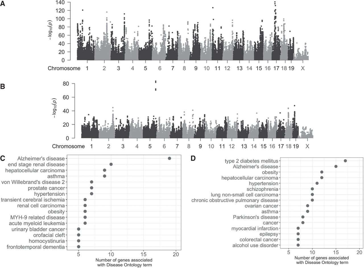 Mouse cross-population multitrait meta-analysis of physiological measurements related to the response to high-fat diet (A) and glucose-related endpoints (B), identifying gene orthologs annotated to Alzheimer's disease (C), type 2 diabetes (D), and other inflammatory diseases.
