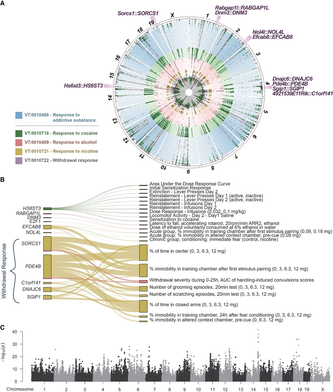 Cross-species integration of human multisubstance GWAS with mouse cross-population multitrait meta-analyses of 360 or more traits grouped by vertebrate trait (VT) ontology term. (A) The circular plot provides a bird's eye view of these five mouse meta-analyses, variant effects, and associated pleiotropic genes detected in both mouse and human GWASs across multiple substances (Hatoum et al. 2023). Genomic regions of variants associated to these genes are highlighted, with associated mouse genes and their human orthologs annotated along the outer ring. The colors of each ring correspond to separate meta-analyses for response to addictive substance (blue), cocaine (green), alcohol (red), nicotine (orange), and withdrawal response to addictive substance (purple). Dots, colored by substance, indicate measures in which the variant effect exists (m-value > 0.9) (Han and Eskin 2011) to enable discernment between substance-specific effects and polysubstance effects. A full resolution version with annotations of all associated mouse genes is available (Supplemental Fig. S4). (B) The Sankey plot shows the number of variants affecting the mouse traits and the associated orthologous genes. The width of the line represents the number of variants, and the color of the line represents the substance (green indicates cocaine; red, alcohol; orange, nicotine). (C) The Manhattan plot of the meta-analysis of the parent term, response to addictive substance (VT: 0010488) on 366 mouse traits.
