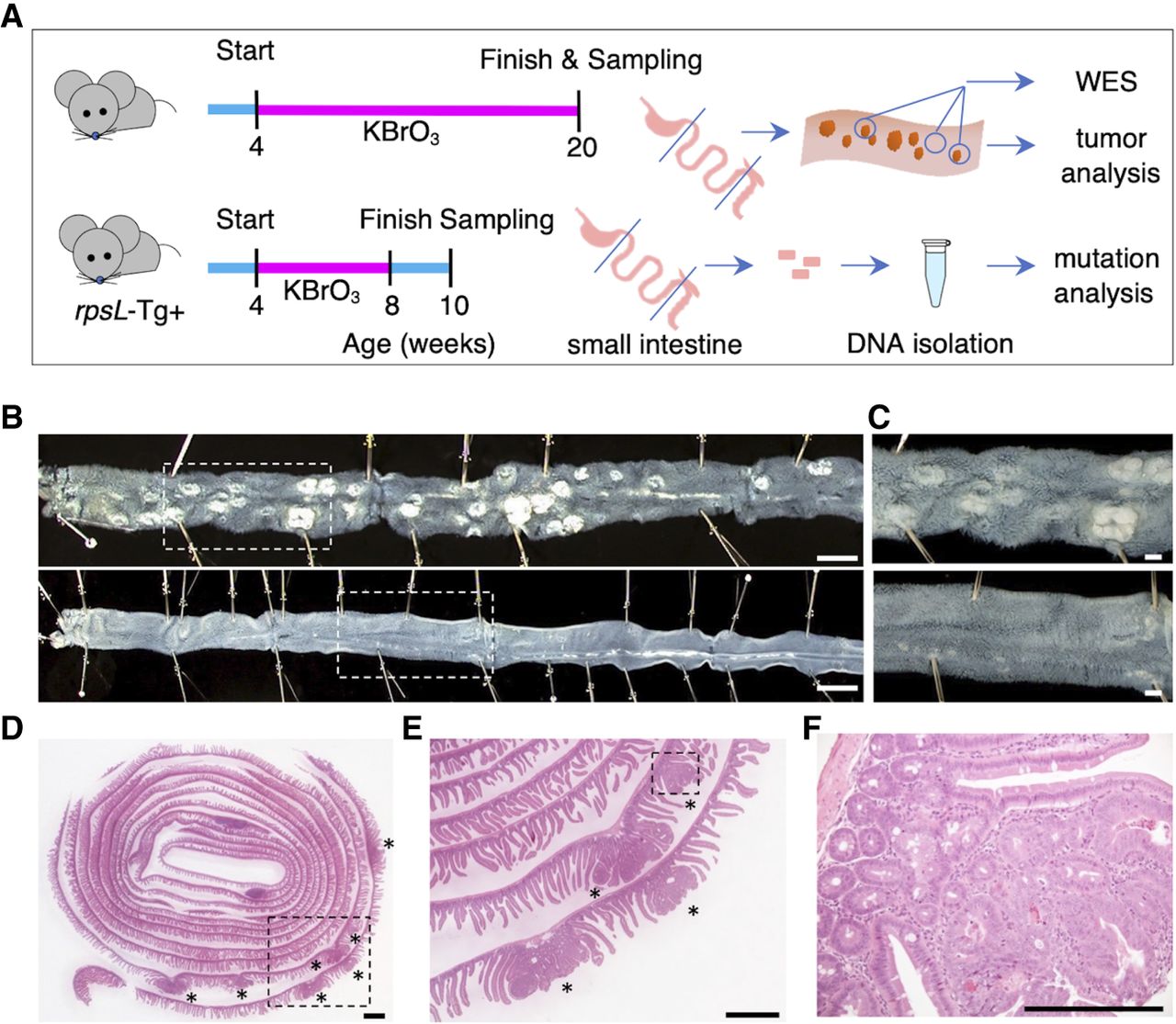 Experimental design and tumor analysis. (A) Experimental design of KBrO3 administration. Schedule for tumor analysis (upper) for rpsL mutation analysis (lower). Blue and magenta lines indicate the administration period of regular water or KBrO3-containing water, respectively. (B) Formalin-fixed small intestines (duodenum to ileum, right to left) collected from 0.15% KBrO3-treated mice. Upper panel: specimens from Mutyh−/− mouse. Multiple tumors (white spot-like parts) are observed. Lower panel: specimens from Mutyh+/+ mouse. No visible tumor was observed. Scale bars indicate 1 cm. (C) Magnified images of B. The scale bar indicates 1 mm. (D–F) HE-stained section of StR of the small intestine (Supplemental Methods) of 0.15% KBrO3-treated Mutyh−/− mice. The scale bar indicates 1 mm. (D) Multiple tumors (asterisks) at the outer side correspond to the region of the duodenum and jejunum. (E) Magnified view of the marked area in D, with >1-mm sized tumors (polyp-like form) among normal villi. (F) Magnified view of the marked area in E.