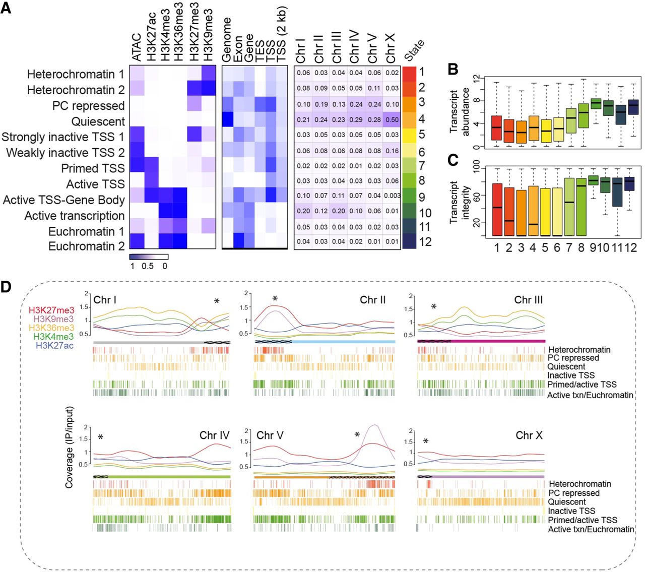 Characteristics of germline chromatin states. (A) Annotated chromatin states from isolated germ nuclei (IGN). (Left) The probability of each histone mark or open chromatin for each of the 12 defined states (as a range from zero to one) is plotted as a heatmap. (Middle) The genomic coverage across gene features for each state. (Right) The percentage of each chromosome in each state. (B) Transcript abundance (as log FPKM) of the genes located within each chromatin state. (C) Percentage of transcript integrity, which measures how prone to degradation a transcript is, of the genes within each chromatin state. (D) Distribution of individual histone modifications along each chromosome, plotted as the normalized signal (IP/input ratio). Asterisks above each chromosome indicate the end at which the pairing center is located, and the hatching on the chromosome indicates the extent of the pairing center. The 12 chromatin states were condensed into six groups of functionally related marks, with the distribution across each chromosome represented by hash marks underneath.