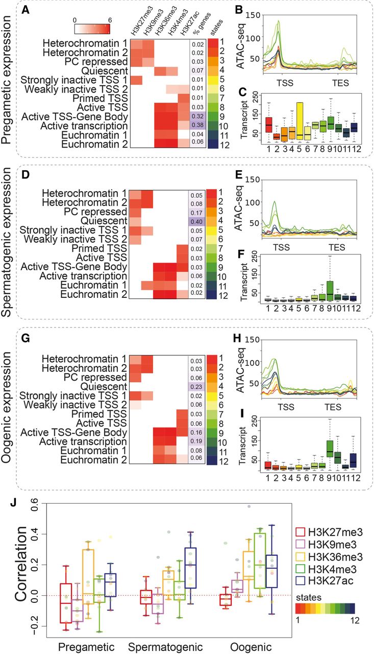 Chromatin states of classes of germline-expressed genes in IGN. (A–C) Pregamete-enriched gene class, (D–F) spermatogenesis-enriched gene class, and (G–I) oogenesis-enriched gene class (Lee et al. 2017). (A,D,G) Heatmap of histone mark coverage in each state, with the percentage of genes in each state to the right. (B,E,H) Chromatin accessibility across chromatin states. Each line represents a chromatin state by assigned color. Normalized signals (as IP/input ratio) were plotted across the upstream region (TSS − 2000 bp), gene body, and downstream region (TES + 2000 bp). (C,F,I) Transcript abundance as FPKM. Values related to each state are plotted. (J) Pearson's correlation between transcript abundance (FPKM) in IGN and histone mark levels (as normalized IP/input signal) for spermatogenic, oogenic, and pregametic gene classes. Each point represents a single chromatin state with the color code as in Figure 1.