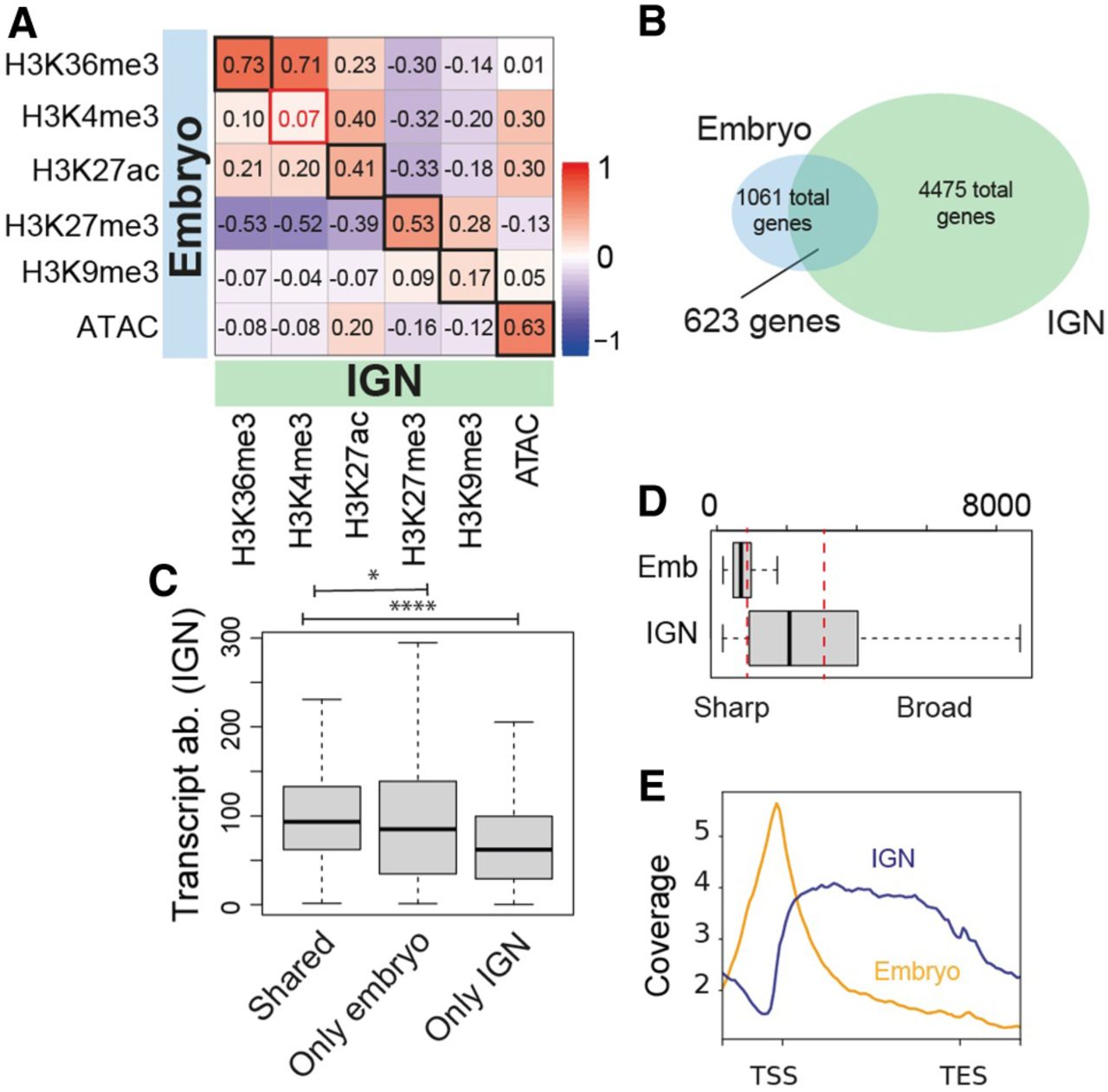H3K4me3 distribution differs between IGN and embryo. (A) Pearson's correlation plot for IGN (horizontal) versus embryo (vertical) for each histone modification. (B) Overlap of genes marked by H3K4me3 in IGN versus embryos. Significance assessed by hypergeometric distribution. (C) Transcript abundance in IGN for IGN-specific, embryo-specific, and shared genes. P-value legend: (*) <0.05, (**) <0.005, (***) <0.0005, (****) <0.0005. (D) Breadth of H3K4me3 peaks in embryos (left) and IGN (right). (E) Metagene plots of H3K4me3 signal (as normalized IP/input ratio) around genes marked by H3K4me3 in IGN and embryo.
