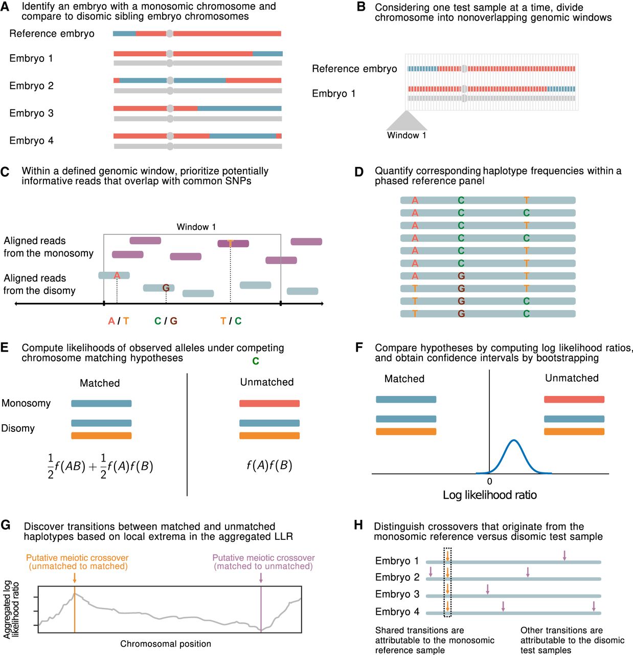 A statistical approach for meiotic crossover discovery based on low-coverage sequencing data from preimplantation genetic testing. (A) Crossover detection is based on haplotype matching between a monosomic chromosome (which is phased by default) and the disomic chromosomes of sibling embryos from the same IVF case. (B) Analysis is conducted within nonoverlapping genomic windows on the scale of 10–100 kbp, defined by the length of typical human haplotypes. (C) Within each window, two to 18 reads are resampled, prioritizing potentially informative reads that overlap common polymorphisms in the population. (D) Frequencies and joint frequencies (i.e., haplotype frequencies) of these SNPs are quantified within an external phased genetic reference panel. (E) Based on these frequencies, the likelihoods of the observed reads are computed under both the matched- and unmatched-haplotype hypotheses. (F) The hypotheses are compared by computing a likelihood ratio, with variance estimated by bootstrapping. (G) Local extrema in the aggregated log-likelihood ratio indicate the locations of meiotic crossovers. (H) Putative crossovers observed in the majority of sibling embryos can be attributed to the monosomic reference chromosome, whereas the remaining crossovers are attributed to the test samples.