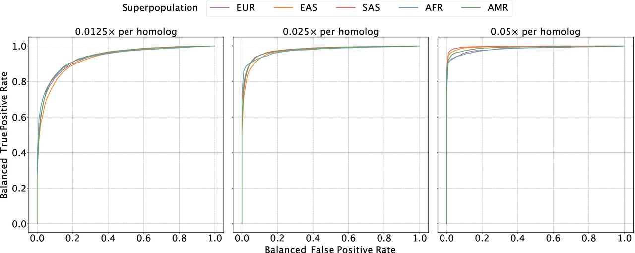 Evaluating the sensitivity and specificity of meiotic crossover detection based on simulation. Using data from the 1000 Genomes Project, we simulated pairs of monosomy 16 and disomy 16, in which half of the pairs possessed matched haplotypes and the other half possessed unmatched haplotypes. Then we divided Chromosome 16 into 45 bins (of ∼2 Mbp) and calculated a balanced ROC curve (see Methods) for each bin, averaging over all the balanced ROC curves to obtain a mean balanced ROC curve. We repeated this procedure over a range of depths of coverage and across sets of samples from all superpopulations of the 1000 Genomes Project, abbreviated as follows: (AMR) admixed American, (AFR) African, (EAS) East Asian, (EUR) European, (SAS) South Asian.