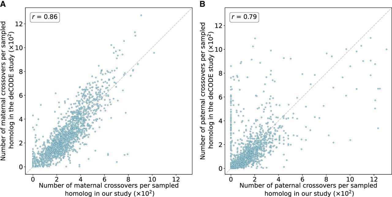 Number of maternal (A) and paternal (B) crossovers per sampled homolog in genomic bins compared between our study and published genetic maps from deCODE. Data from deCODE were obtained from Halldorsson et al. (2019). Crossovers were identified as transitions between regions of “matched” and “unmatched” haplotypes, in which each region included at least 15 genomic windows and a z-score of at least 1.96. Pearson correlation coefficients (r) between the deCODE map and our map across genomic bins are reported for each panel (for chromosome-specific comparison, see Supplemental Figs. S9, S10).