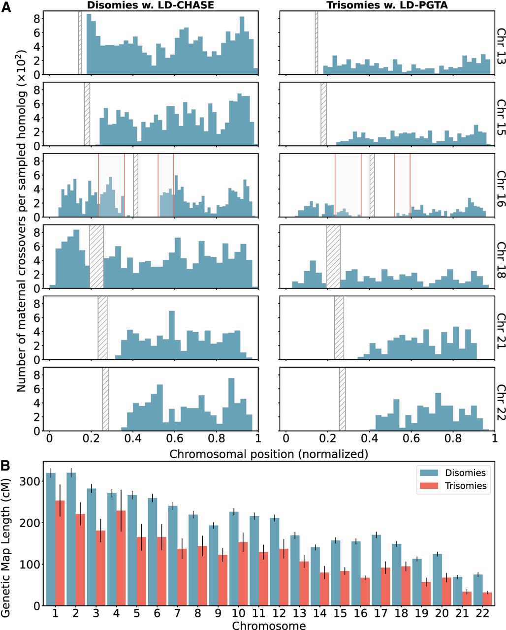 Differences in number and location of inferred crossovers between disomic and trisomic samples. (A) Spatial distributions of inferred meiotic crossovers in disomies (left; mapped with LD-CHASE) and trisomies (right; mapped with LD-PGTA) across Chromosomes 13, 15, 16, 18, 21, and 22. Regions with qualitative differences are highlighted in light gray, whereas centromeres are indicated with diagonal shading. (B) Comparisons of female genetic map length for disomies (blue) versus trisomies (red) for each autosome. The observed rates of meiotic crossover were consistently lower for trisomies compared with disomies. Error bars denote 95% confidence intervals as estimated by bootstrapping.