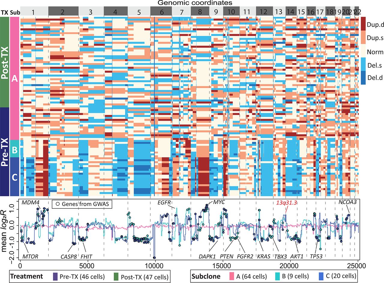 Subclone clustering of the KTN126 patient using FLCNA. Cell clusters and copy number profile with different CNA states (deletion of double copies [Del.d], deletion of a single copy [Del.s], normal/diploid [Norm], duplication of a single copy [Dup.s], and duplication of double copies [Dup.d]) were generated using FLCNA. The mean logarithm transformation of ratio between normalized read counts and its sample-specific mean (log2R) was provided for each cluster. Shared CNAs identified using FLCNA were matched to significant genes from the genome-wide association studies (GWASs) in the NHGRI-EBI GWAS Catalog. (Pre-TX) Pretreatment, (Post-TX) posttreatment.