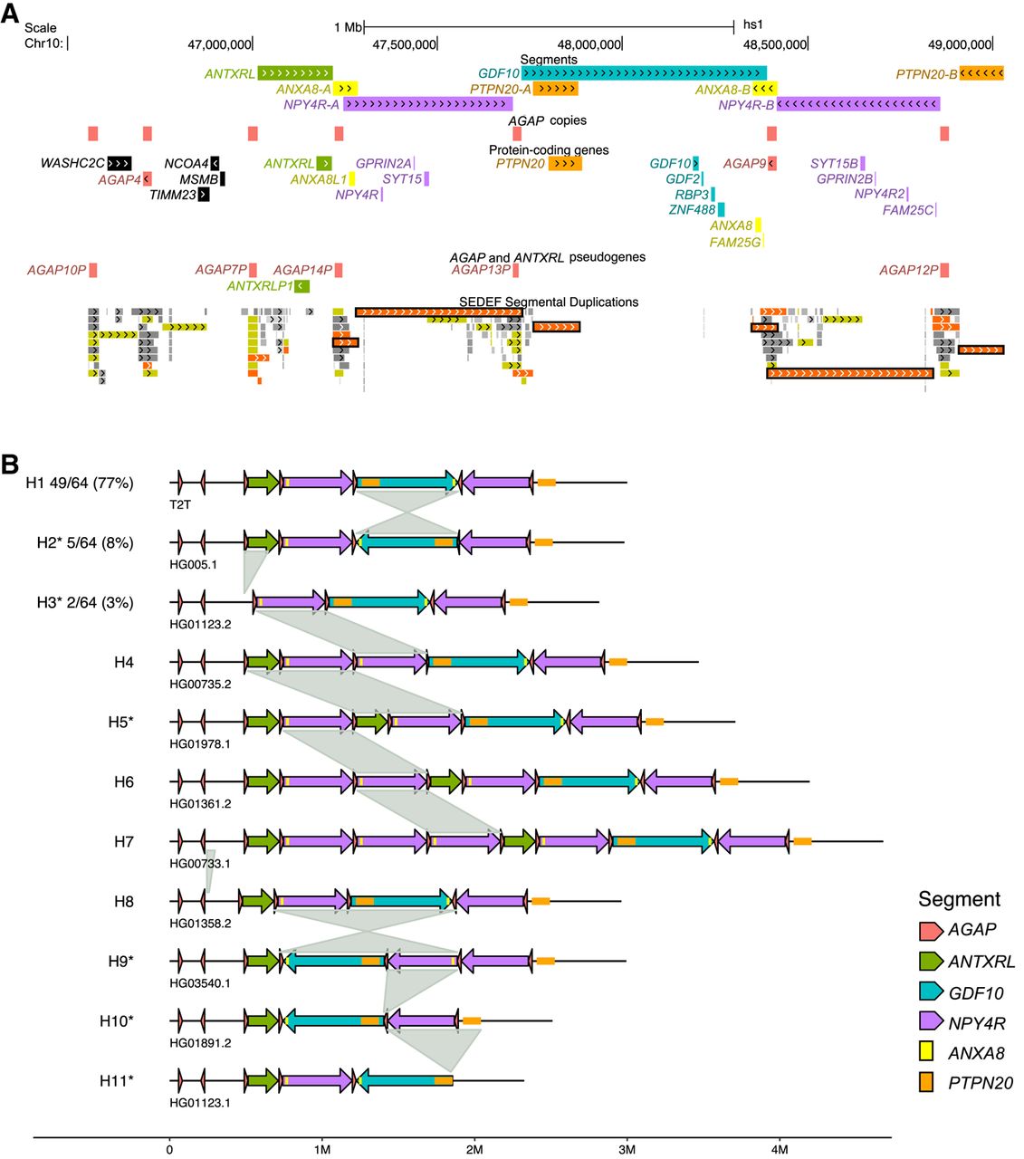 Structural variation at the 10q11.22 chromosomal region. (A) Annotation of segments, genes, and SDs. View in the UCSC Genome Browser on human T2T-CHM13 v2.0 of the region Chr 10: 46,500,000–49,100,000. The following segments are drawn: ANTXRL (green), NPY4R-A/B (violet), ANXA8-A/B (yellow), PTPN20-A/B (orange), and GDF10 (blue). ANXA8-A overlaps NPY4R-A whereas ANXA8-B is just outside the NPY4R-B segment. The location of AGAP copies (protein-coding genes and pseudogenes) is shown with red boxes. Protein-coding genes and the ANTXRL pseudogene are indicated, with the text colored according to the segment to which they belong. At the bottom, SD annotation with colors reflecting the level of similarity: light to dark gray for 90%–98%; yellow for 98%–99%; orange for similarity >99% (Numanagic et al. 2018; Vollger et al. 2022). Black rectangles mark the three pairs of inverted SDs that overlap the NPY4R, ANXA8, and PTPN20 segments, respectively. (B) Schematic of 11 alternative haplotypes identified in 64 haploid genomes. Numbers next to H1, H2, and H3 haplotypes represent their frequency. All other haplotypes were identified in a single genome. H1 corresponds to the T2T-CHM13 haplotype and is the most common. Asterisks denote haplotypes validated by the GAVISUNK tool. Gray links between haplotypes highlight the underlying structural variation.