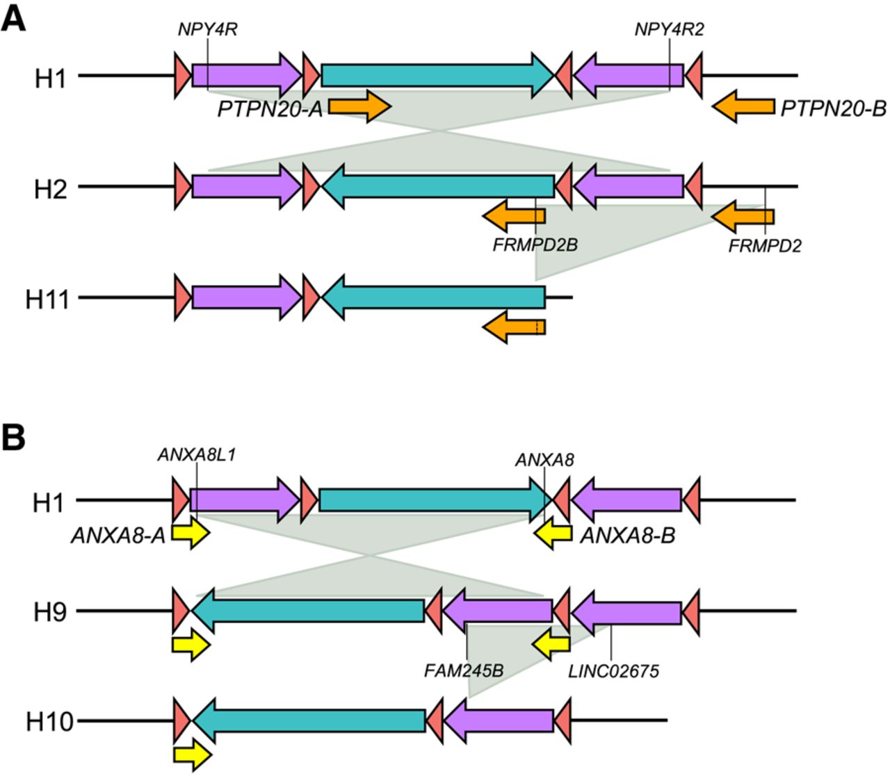 Inversion haplotypes generate new predispositions to copy-number variations. (A) Schematic of H2 and H11 haplotypes. The H2 haplotype differs from H1 by an inversion mediated by NPY4R inverted duplicons (purple arrows). Following this inversion, the PTPN20 duplicons (orange arrows) become in direct orientation and mediate the deletion identified in H11. Genes mapped at the breakpoints are specified. (B) Schematic of H9 and H10 haplotypes. The H9 haplotype differs from H1 by an inversion mediated by ANXA8 inverted duplicons (yellow arrows). Following this inversion, the NPY4R duplicons (purple arrows) become in tandem configuration and direct orientation and mediate the deletion of one copy in H10 haplotype. Genes mapped at the breakpoints are specified.
