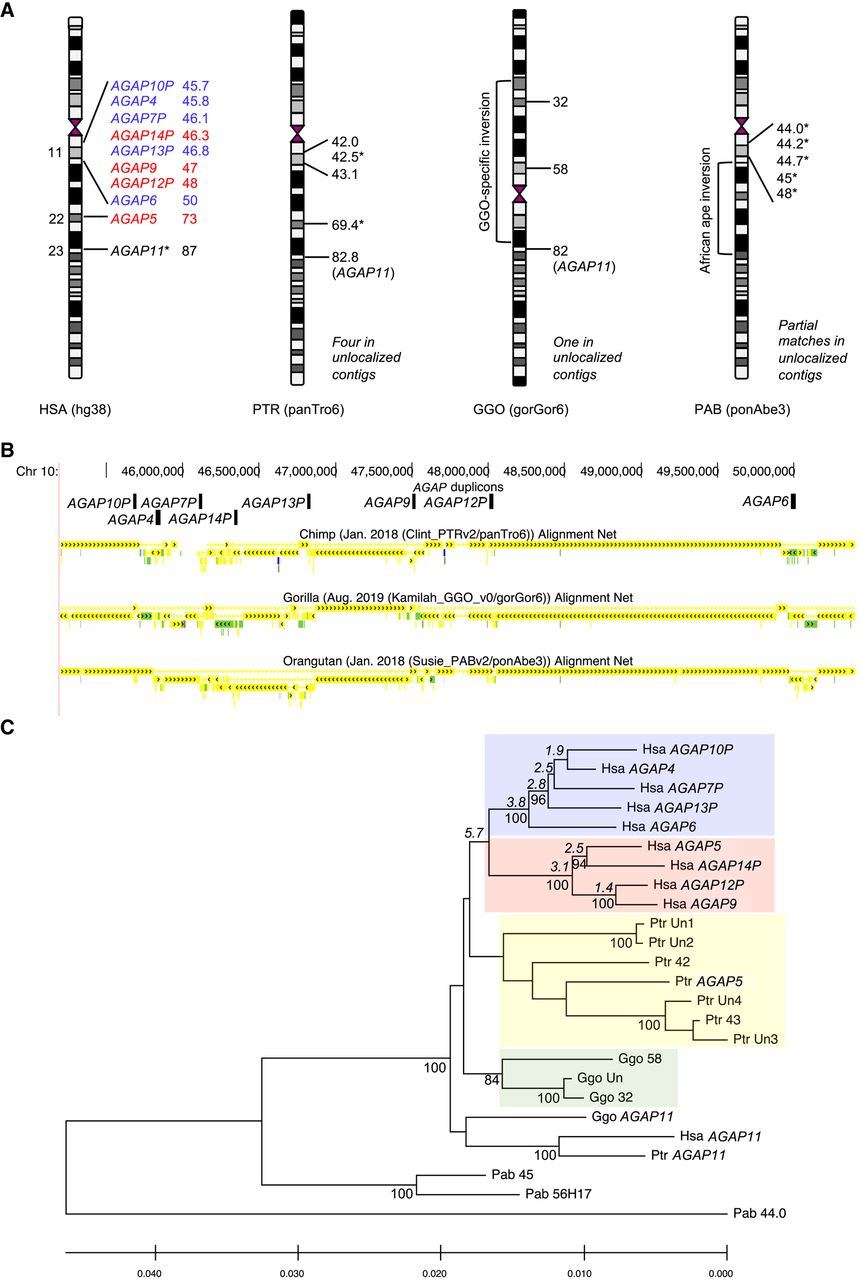 Genomic organization and phylogeny of Chromosome 10 AGAP copies in great apes. (A) Chromosome location (in Mbp) of AGAP copies in human, chimpanzee, gorilla, and orangutan reference genomes according to the most recent releases. In the common ancestor of African apes, a pericentric inversion moved AGAP11 outside the pericentromeric region. Copies with an asterisk (*) are shorter than the others and are thus incomplete. Human AGAP copies are colored according to the clade in the phylogenetic tree shown in C. (B) Pairwise genomic sequence alignments of the q-arm pericentromeric region of human Chromosome 10 with great ape genomes (UCSC track of primate net alignments). The location of AGAP duplicons is shown. (C) Phylogeny of Chromosome 10 AGAP copies in great apes. The tree was inferred by using the Maximum Likelihood method and Kimura 2-parameter model. The tree is drawn to scale, with branch lengths measured in the number of substitutions per site. All positions containing gaps and missing data were eliminated (complete deletion option). There were a total of 4961 positions in the final data set. Bootstrap values >75 are shown next to significant nodes. Timing estimates in millions of years of split events between human AGAP copies are shown in italics.