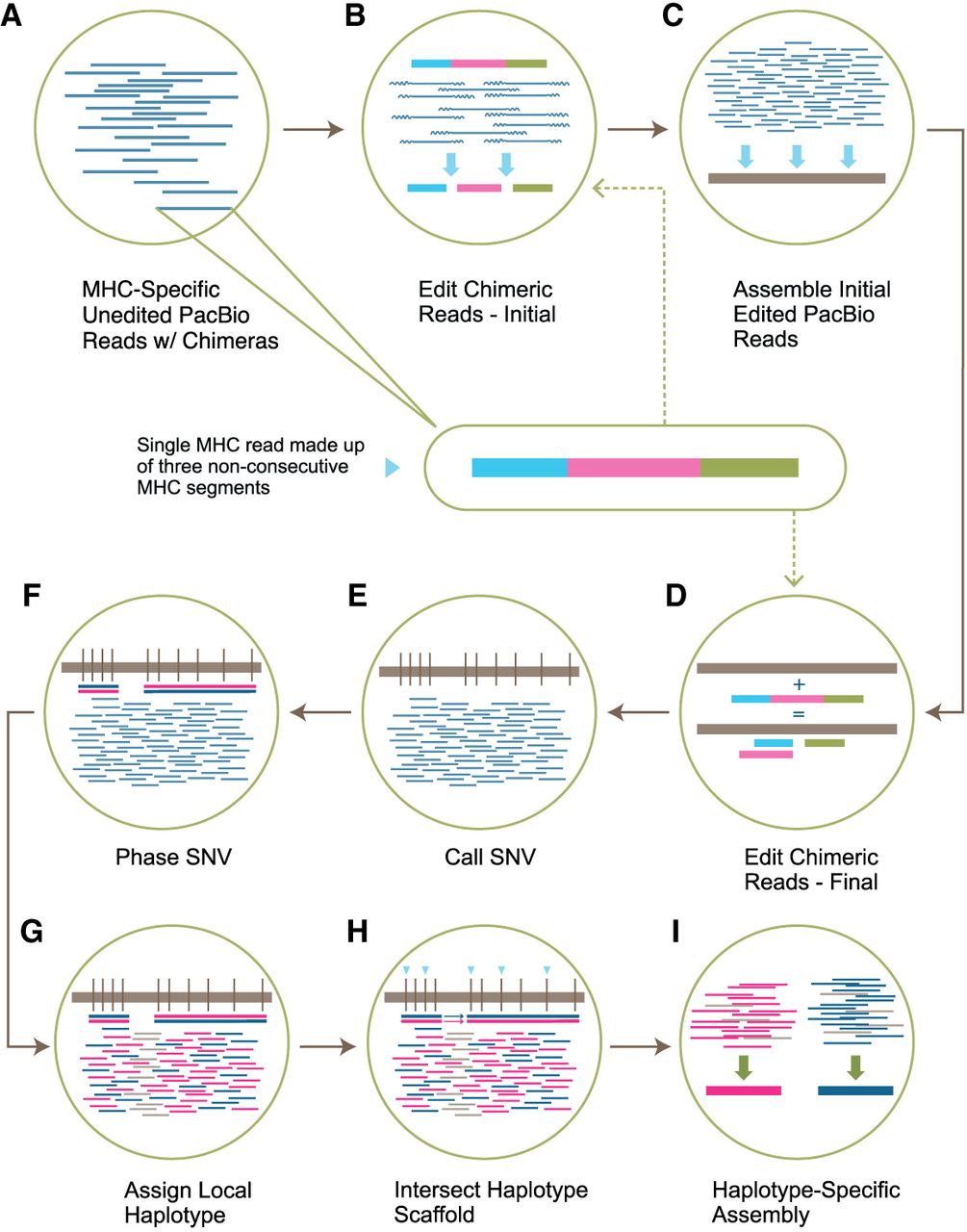 Read editing and haplotype binning detail. (A) Unedited PacBio reads that align to one of the 160 MHC haplotypes in the reference sequence. Inset shows the composition of a single read containing three nonconsecutive or palindromic MHC sequences (chimera) represented by three colors. (B) The purpose of this step is to split each chimeric read into individual segments (initial edited reads). This is done by overlapping chimeric reads and identifying positions along each chimeric read with a buildup of overlap termination sites. (C) Initial edited reads are assembled into haploid mosaic contigs. (D) A final round of chimeric read editing aims at further improving the detection of the chimera boundaries. The chimeric MHC-specific reads from A are aligned to the collapsed assembly, which acts as a reference sequence. The chimeric read is then split based on the reported aligned segments (final edited reads). (E) SNVs are called across the collapsed assembly and (F) SNVs are phased using the final edited read alignments. (G) Final edited reads are assigned a local haplotype if they intersect with variants in a phased block (pink segment = haplotype 1, blue segment = haplotype 2, gray segment = on both haplotypes). (H) Each locally phased block is oriented to the full MHC haplotype by intersecting with the reference-based haplotype scaffold (light blue triangles). (I) Haplotype-specific edited reads are combined with homozygous reads and assembled independently into haplotype-specific assemblies.