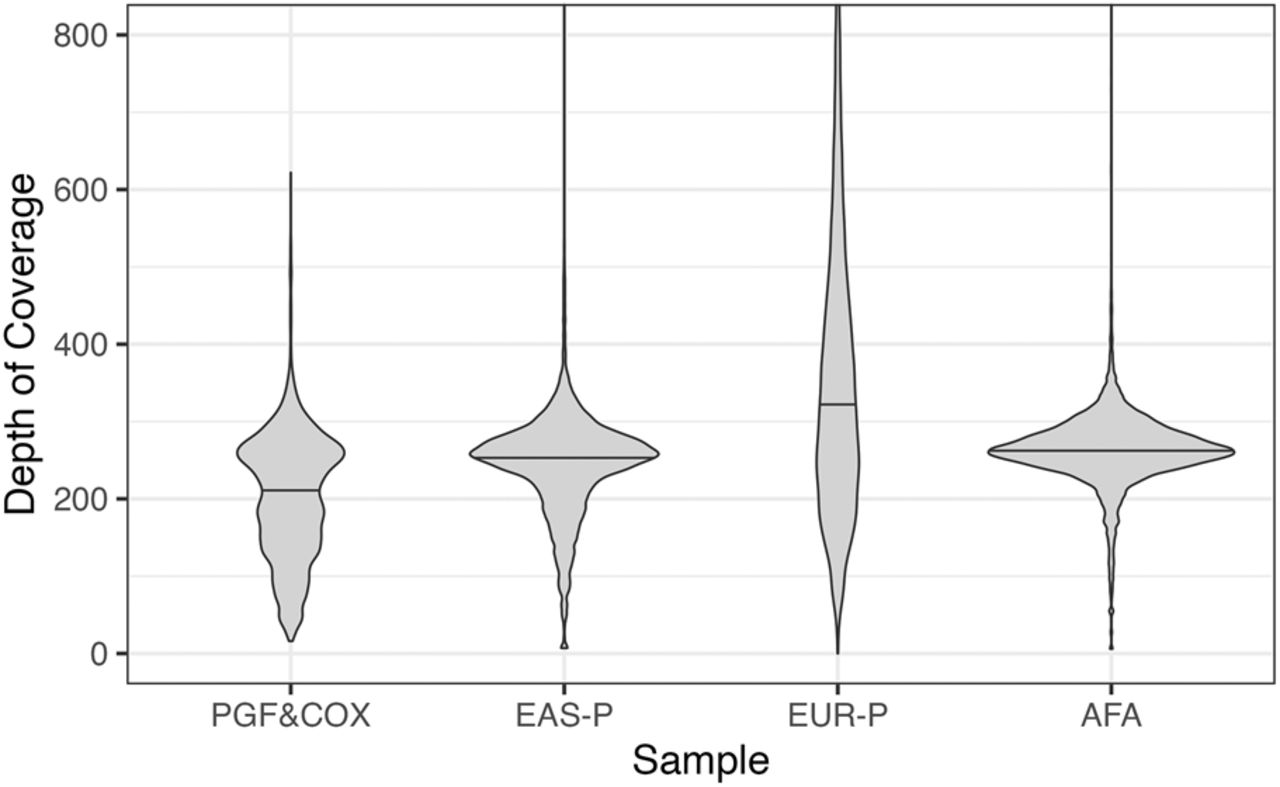 Depth of coverage across the reference MHC sequence after read selection and digital normalization. Digital normalization is not performed on EUR-P because the majority of the reads are not HiFi quality. The median depth of coverage in each sample is represented by a horizontal black bar.