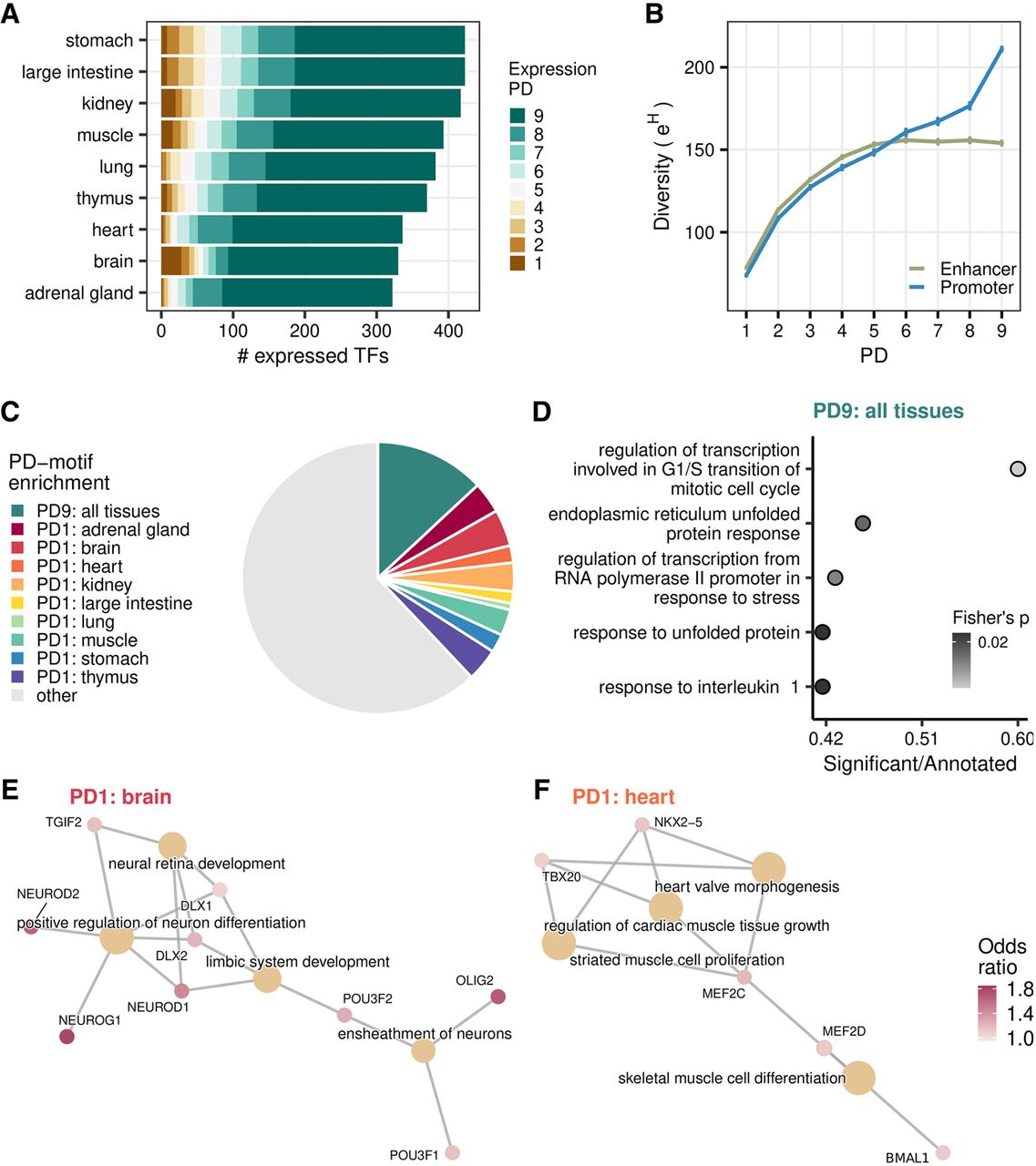 TFBS repertoire diversity and enrichment across tissue-specific and pleiotropic CREs. (A) An overview of the PD of TF expression (EPD) across tissues. (B) TFBS repertoire diversity increases with PD, particularly across promoters. Depicted are mean values ± SEM. (C) Overview of the overrepresented motifs in PD9 and PD1 CRE sequences. Depicted are binding site preferences for 643 motifs, the respective TFs of which are detected in the expression data. If a motif showed the highest binding proportion to PD9 CREs consistently within each tissue-CRE, it was assigned as overrepresented in PD9. If a motif showed the highest binding proportion to a PD1 of a particular tissue, but not that of others, it was assigned as PD1 enriched for that tissue. (D) Top five categories of gene set enrichment analysis of PD9-enriched motifs using all motifs as background (Gene Ontology, biological process, Fisher's exact P-value < 0.05). (E,F) Top four categories of gene set enrichment analysis of tissue-specific PD1 enriched motifs using all motifs as background (Gene Ontology, Biological process, Fisher's exact P-value < 0.05). (E) Brain-specific PD1 overrepresented motifs. (F) Heart-specific PD1 overrepresented motifs. (E,F) Odds ratio is based on the proportion of tissue-specific PD1 CREs with the motif over the global average proportion for that motif.