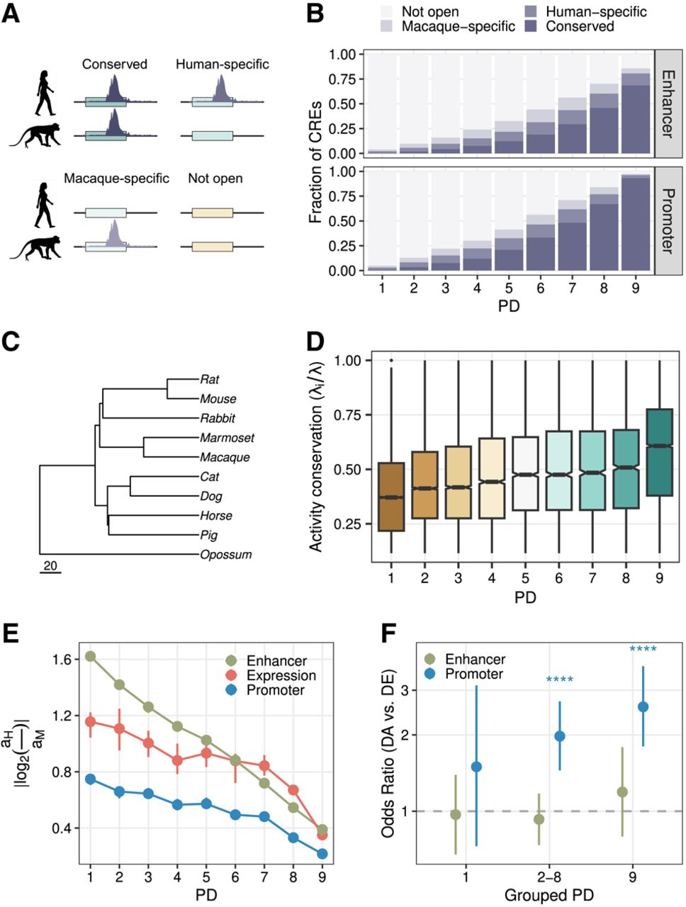 PD and evolutionary conservation of expression and regulatory activity. (A,B) The fraction of enhancers and promoters of different PDs as defined using data from nine tissues from the Epigenomics Roadmap Project, which overlapped with ATAC-seq peaks called in neural progenitor cell lines (NPCs) from cynomolgus macaques and humans. The colors indicate whether a human DHS-derived CRE overlapped with an NPC ATAC-seq peak from humans, cynomolgus macaques, both, or none. (C) The phylogeny from Bininda-Emonds et al. (2007) of species for which Roller et al. (2021) provided activity estimates for four tissues based on histone marks. Scale, million years ago. (D) Activity conservation for orthologous CREs based on Roller et al. (2021) (n = 47,377). We calculate the ratio subtree length λS for species in which the CRE is active over the total tree length λT. (E) Mean absolute log2-fold changes of gene expression and activities between humans and cynomolgus macaques. Error bars, 95% bootstrap CIs. PD9 genes (CREs) show more conserved expression (activity) than do more tissue-specific genes (CREs). (F) Enrichment (odds ratio > 1) of differentially accessible CREs with differentially expressed genes between humans and cynomolgus macaques using matched regulatory landscapes (n = 6882). Error bars, 95% CIs of the odds ratio. Asterisks indicate BH-adjusted Fisher's test P-value: (*) <0.05, (**) <0.01, and (***) <0.001.
