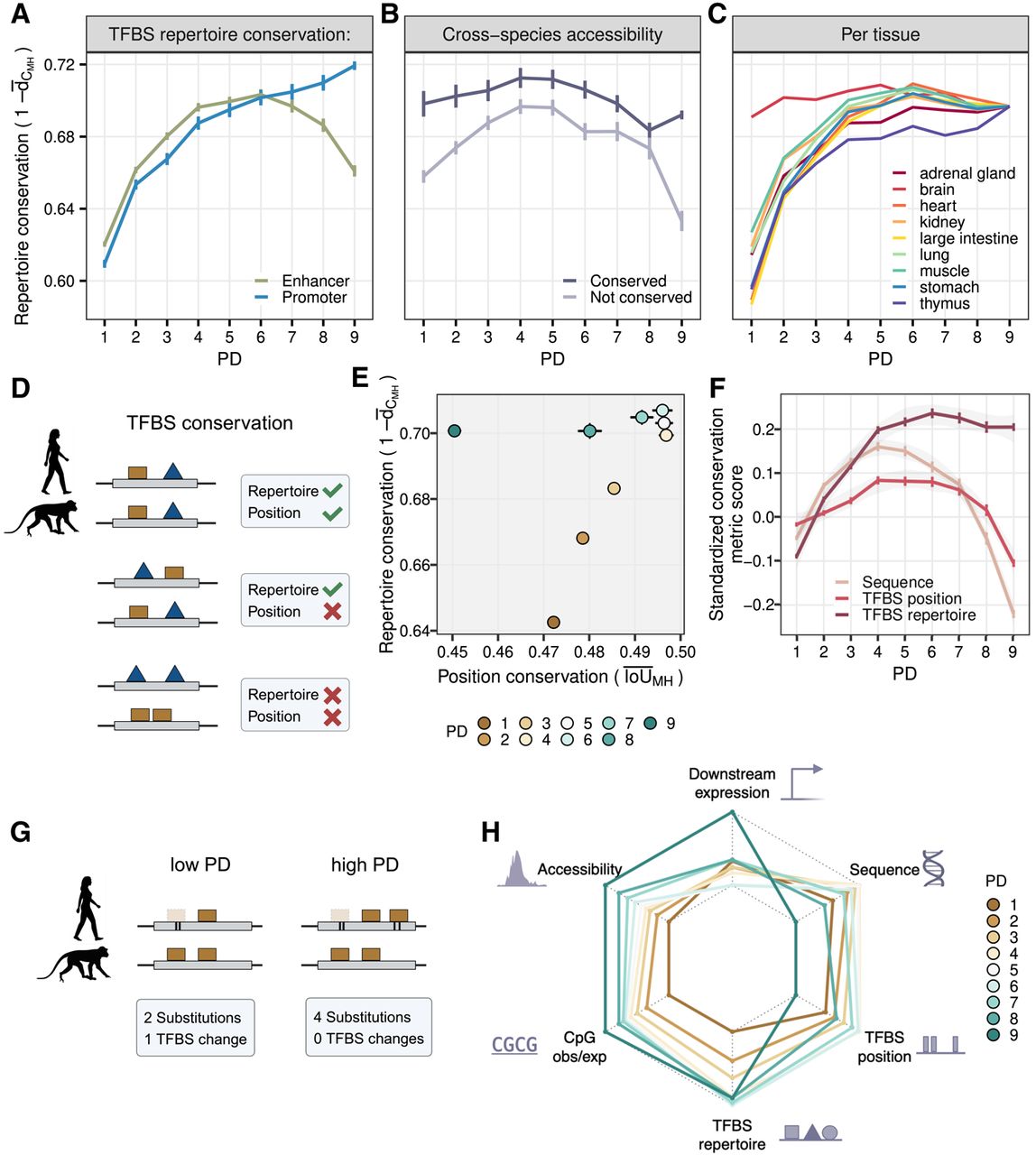 mechanisms. (H) A summary of the scaled average conservation metric scores across PDs. Sequence, primate phyloP scores; TFBS position,