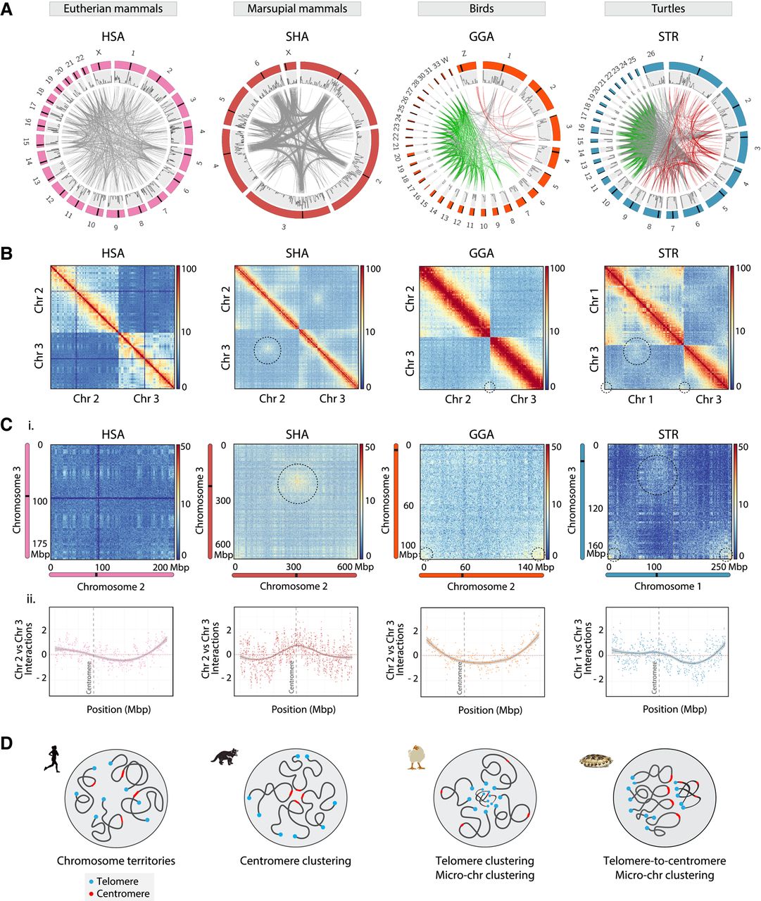 Divergent patterns of nuclear architecture. (A) Circos diagrams depicting interchromosomal interactions in human (Homo sapiens [HSA], Rao et al. 2014), Tasmanian Devil (Sarcophilus harrisii [SHA], Álvarez-González et al. 2022a), chicken (Gallus gallus [GGA], Fishman et al. 2019), and Northern Giant Musk Turtle (Staurotypus triporcatus [STR], this study). In each plot, the chromosomes are illustrated in the outer colored track, whereas the inner gray track illustrates the histogram of the absolute value of the interaction at each genomic position. The color of the links at the center of each Circos plot indicates different types of interactions: full set of interactions (gray links), interactions among macrochromosomes (red links), and interactions among microchromosome (green links). (B) Hi-C contact maps representing a pair of macrochromosomes for human (HSA, Rao et al. 2014), Tasmanian Devil (SHA, Álvarez-González et al. 2022a), chicken (GGA, Fishman et al. 2019), and Northern Giant Musk Turtle (STR, this study). Note the centromeric interactions in the Tasmanian Devil, the telomeric interactions in the chicken, and the telomeric–centromeric interactions in the turtle highlighted by dashed-line circles. (Ci) Heatmaps showing normalized interchromosomal interactions between heterologous chromosomes in human (Chromosomes 2 and 3), Tasmanian Devil (Chromosomes 2 and 3), chicken (Chromosomes 2 and 3), and Northern Giant Musk Turtle (Chromosomes 1 and 2). Telomeric, centromeric, and telomeric–centromeric interactions are highlighted by dashed-line circles. The position of centromeres is denoted by black lines for each chromosome. (Cii) Z-score interactions as a function of genomic distance for representative chromosomes of human, Tasmanian Devil, chicken, and musk turtle. Dashed horizontal lines denote the centromere location. (D) Representation of chromosome position inside nuclei of species showing chromosomal territories (CTs) without centromere clustering (human), centromere clustering (Tasmanian Devil), telomere clustering (chicken and musk turtle), and telomere–centromere associations (musk turtle). Centromeres are depicted in red and telomeres in blue.