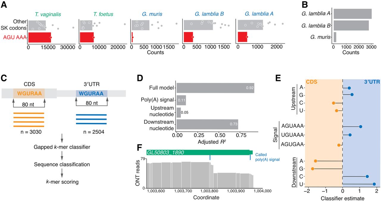 Importance of 3′ adjacent nucleotide of the WGURAA hexamer for distinguishing poly(A) signals from open reading frame hexamers. (A) Occurrence of AGU AAA dicodon in comparison to other Ser-Lys encoding dicodons in coding sequences within Metamonada clade. Dicodon occurrence was calculated only in frame. Each point represents one dicodon combination and the bar shows the mean count value for all compared combinations. AGU AAA was shown to be depleted in the Giardia genus, but not in other species. Data for AAA AGU, UGU AAA, and AGU GAA dicodons are shown in Supplemental Figure S3A. (B) WGURAA hexamer occurrence in the coding sequences of Giardia species. Occurrence was calculated independent of the reading frame. (C) Schematic representation of the machine learning approach to distinguish WGURAA sequences in 3′ UTRs versus coding sequences. WGURAA sequences were extracted from coding sequences and 3′ UTRs and together with 37 flanking nucleotides from both sides (80-mer) put into a gapped k-mer support vector machine classifier, which performed sequence classification and k-mers scoring. (D) Variance explained by the linear model applied to WGURAA-containing k-mers scores from gkmSVM classifier by the full model, upstream nucleotide, poly(A) signal, and downstream nucleotide in G. lamblia. Explained variance was measured as an adjusted R2 value. Data for G. lamblia B are shown in Supplemental Figure S3C. (E) Beta-coefficient values from the linear model applied to WGURAA-containing k-mers scores from gkmSVM classifier, corresponding to the upstream nucleotide, poly(A) signal, and downstream nucleotide in G. lamblia. Data for G. lamblia B are shown in Supplemental Figure S3B. (F) Example of G. lamblia A gene GL50803_1890 where a hexamer in the coding sequence was misclassified by gkmSVM. Premature cleavage after the hexamer inside the coding sequences indicated as coverage drop was observed. Similar example from G. lamblia B is shown in Supplemental Figure S3D.