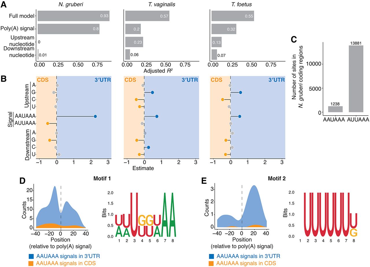 Flanking nucleotides play a role in poly(A) signal recognition in other Metamonada, but not N. gruberi. (A) Variance explained by the linear model applied to AWUAAA-containing k-mers scores from gkmSVM classifier. In the outgroup organism N. gruberi, signal sequence is the main determinant, whereas in T. vaginalis and T. foetus from Metamonada upstream nucleotides have substantial contributions. (B) Beta-coefficient values from the linear model form A. (C) AAUAAA and AUUAAA hexamer occurrence in the coding sequences of N. gruberi. Occurrence was calculated independent of the reading frame. (D,E) Auxiliary elements help specify genuine AAUAAA poly(A) signals in N. gruberi, putative upstream (D) and downstream (E) motifs and their quantifications around AAUAAA poly(A) signals.