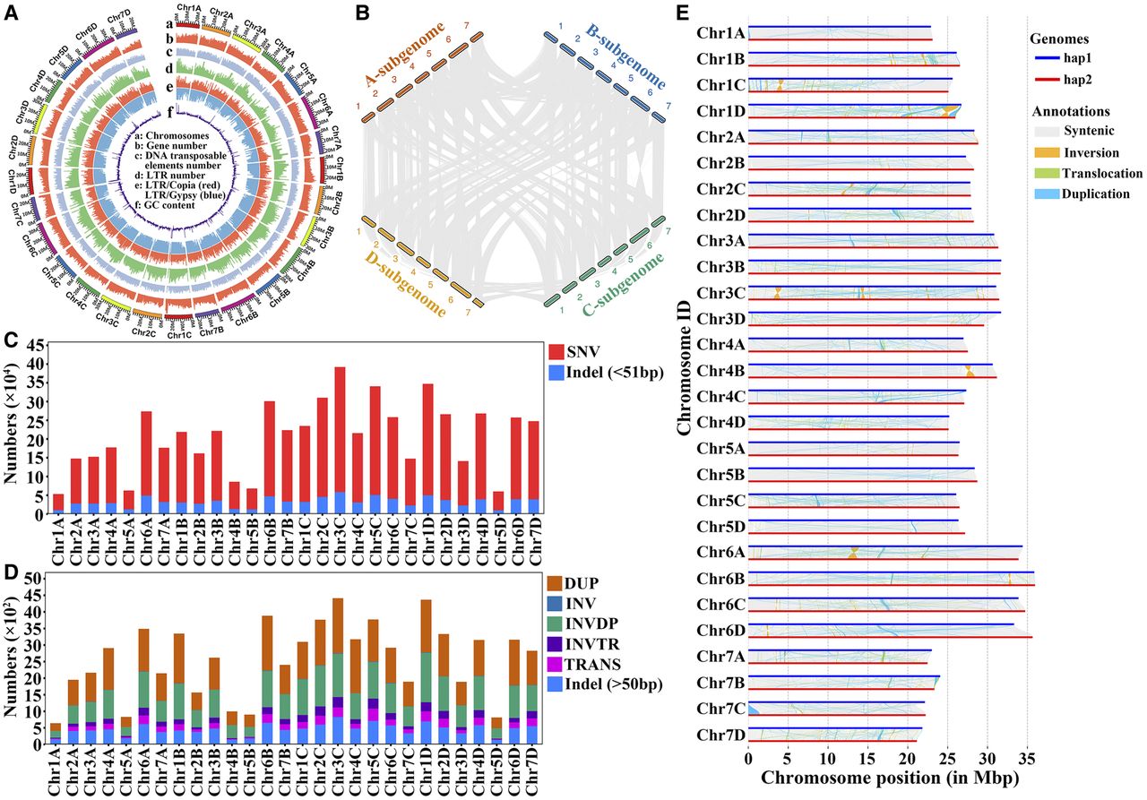 Genome assembly of “Beni hoppe” and variations between hap1 and hap2. (A) Genomic features of the “Beni hoppe” genome FaBen. All statistics were computed for windows of 100 kb. (B) Intergenomic syntenic analysis between A–D subgenomes of FaBen. (C) Number of SNVs and indels (<51 bp) in the same chromosome pair between hap1 and hap2. (D) Number of structural variations in the same chromosome pair between hap1 and hap2. (DUP) duplicated region, (INV) inverted region, (INVDP) inverted duplicated region, (INVTR) inverted translocated region, (TRANS) translocated region. (E) Structural variations in the same chromosome pair between hap1 and hap2.