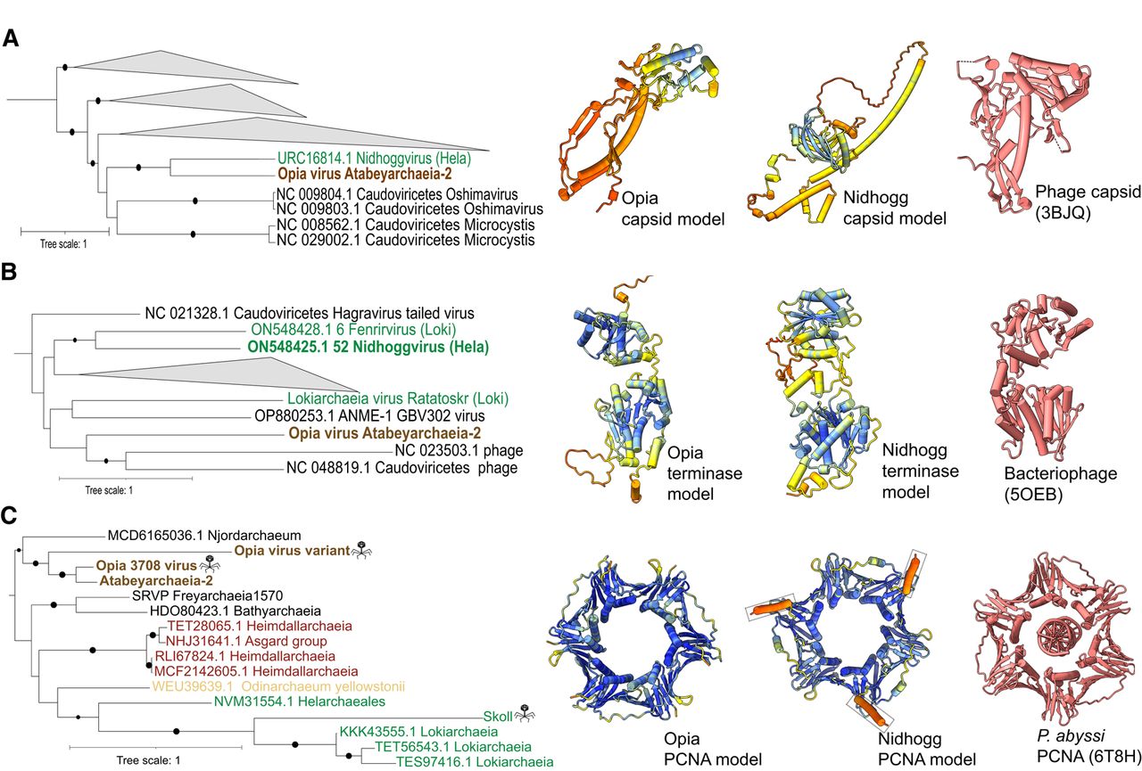 Evolutionary relationships and structural conservation of Opia virus hallmark proteins. (A–C) Maximum-likelihood phylogenetic trees of capsid (A), terminase large subunit (B), and proliferating cell nuclear antigen (PCNA; C). Trees are midpoint-rooted; circles indicate bootstrap support >70%. Insets show structural models: Opia virus (infecting Atabeyarchaeia, this study) and Nidhogg virus (infecting Helarchaeales) colored by AlphaFold3 confidence (blue to red, high to low), with best FoldSeek match in coral. Reference structures: bacteriophage capsid (PDB: 3BJQ) for A, large terminase from thermophilic bacteriophage D6E (PDB: 5OEB) for B, and P. abyssi PCNA (PDB: 6T8H) for C. Scale bars represent one substitution per site. Opia virus variants cluster with other Asgardarchaeota MGEs, highlighting their evolutionary relationships within this archaeal phylum.