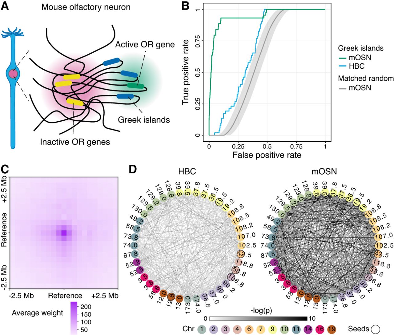 Trans-C identifies the Greek island cluster in mouse olfactory sensory neurons (mOSNs). (A) Schematic of trans contacts in a mOSN. The Greek islands form a multienhancer hub that is segregated from the inactive olfactory receptor (OR) genes. (B) Performance evaluation of trans-C-mediated identification of Greek island clustering. We plot the ROC curve for α = 0.5 in mOSNs versus their progenitors (horizontal basal cells [HBCs]). Trans-C correctly identifies Greek island clustering specifically in mOSNs in a way that is statistically significant (P = 6 × 10−194) versus a matched random seed null model (average and 95% confidence interval from 1000 runs). (C) Aggregated heatmap of trans contacts among the top 60 loci selected by trans-C in mOSNs. Each square in the grid represents an average 250 kb bin in a Hi-C matrix of 21 × 21 bins centered at each interacting pair of loci (reference). The exhibited spot-like structure highlights the highly specific nature of the interchromosomal interactions of the Greek islands. (D) Visualization of the Greek island-associated trans clique identified in mOSNs by trans-C, showcasing the increased significance of loci interactions after differentiation of HBCs, plotted as described for Figure 2D.
