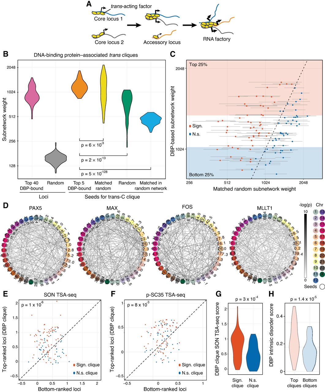 Trans-C identifies DNA-binding protein–associated trans cliques proximal to nuclear speckles. (A) Schematic of the mechanistic hypothesis for the formation of specialized RNA factories involving trans-interacting chromatin domains. Multiple copies of trans-acting regulatory factors (i.e., transcription or splicing factors) bind to core nucleic acids, aggregate to form new clusters and/or enrich pre-existing ones, and recruit accessory coregulated nucleic acids. RNA factories promote the efficacy and accuracy of RNA biogenesis processes (thicker black arrows). (B) Trans-C-identified subnetworks in lymphoblastoid cells built from loci characterized by strong binding of 110 DBPs have dense contacts. We plot the distribution of subnetwork weights for six types of sets of 40 loci: (1) loci with the highest number of ChIP-seq peaks for a given DBP (pink), (2) randomly drawn loci (gray), (3) top loci ranked by trans-C from a seed of five loci with the highest number of ChIP-seq peaks for a given DBP (orange), (4) top loci ranked by trans-C from a random seed of five loci whose starting subnetwork weight was matched to the seed of group 3 (yellow), (5) top loci ranked by trans-C from a seed of five randomly drawn loci (green), and (6) top loci ranked as for group 4 but starting from an interaction matrix that has been randomly shuffled (light blue). On average, sets seeded from loci most strongly bound by DBPs interact more strongly in trans than any of the other five types of sets of loci, including the stringent “matched random” control (P-values by Mann–Whitney U test). (C) For each DBP analyzed in B, we compare the weights of subnetworks obtained with trans-C from “top five DBP-bound” seeds (single data point) and “matched random” seeds (average of 1000 subnetworks ± SD). In red are comparisons with significantly different weights (P < 0.05 after FDR correction). Shaded areas highlight the top and bottom quartile of DBP-based subnetwork weights. (D) Visualization of selected significant DBP-associated trans cliques in lymphoblastoid cells, plotted as described for Figure 2D (PAX5 and MAX, strongest cliques; FOS and MLLT1, highest fold change of clique strength over average strength of cliques in the matched random null model). (E,F) Proximity to nuclear speckles of loci within trans-C-identified cliques, measured as the average SON and p-SC35 TSA-seq signal for the corresponding genomic regions. For each subnetwork, the signal is compared with that of an equal number of loci at the opposite end of the trans-C ranking. DBP-based cliques are overall significantly more proximal to both SON and p-SC35 than matched control sets (P-values by Mann–Whitney U test). Cliques that are significantly stronger compared with the null model in the analysis from panel C (Sign.) are in red, and nonsignificant ones (N.s.) are in blue. (G) The proximity to SON for significant versus nonsignificant cliques from panel C is significantly different by Mann–Whitney U test. (H) The strongest DBP-based subnetworks correspond to DBPs with a higher intrinsically disordered protein (IDP) score. We plot the IDP scores for DBPs resulting in the bottom and top quartiles of DBP-based subnetworks from panel C. The difference is statistically significant by Mann–Whitney U test.