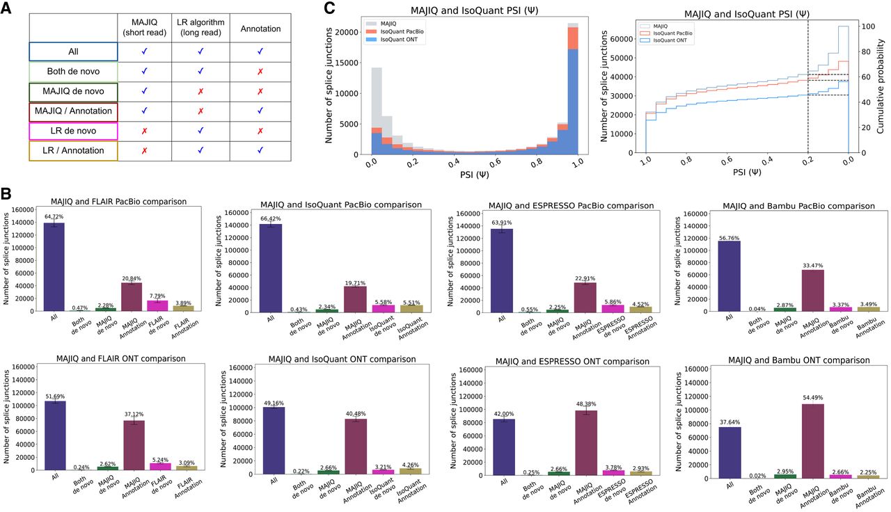 Splice junction comparative analysis. (A) Any detected splice junction can fall into one of six categories, each represented by a color, depending which of the three sources of information (short reads, long reads, annotation) support it. (B) Bar charts corresponding to the aforementioned six categories. Mean and standard error bars are computed using matched data sets from three replicates of human cell-line samples sequenced by LRGASP (Pardo-Palacios et al. 2024). These data include short reads processed by STAR and MAJIQ, long reads from PacBio and ONT assays, and four long-read algorithms used to process the long-read data. (C) Taking the splice junctions reported in B by MAJIQ (green) and assessing the number of those also identified when using PacBio (red) or ONT (blue) long reads, as a function of the PSI values. Here IsoQuant was used for long-read data. Note that if a junction appears in multiple LSVs, the lowest PSI values are chosen (x-axis). The graph on the right is the CDF for the histogram shown on the left. Dashed lines denote splice junctions with a PSI of 20%.