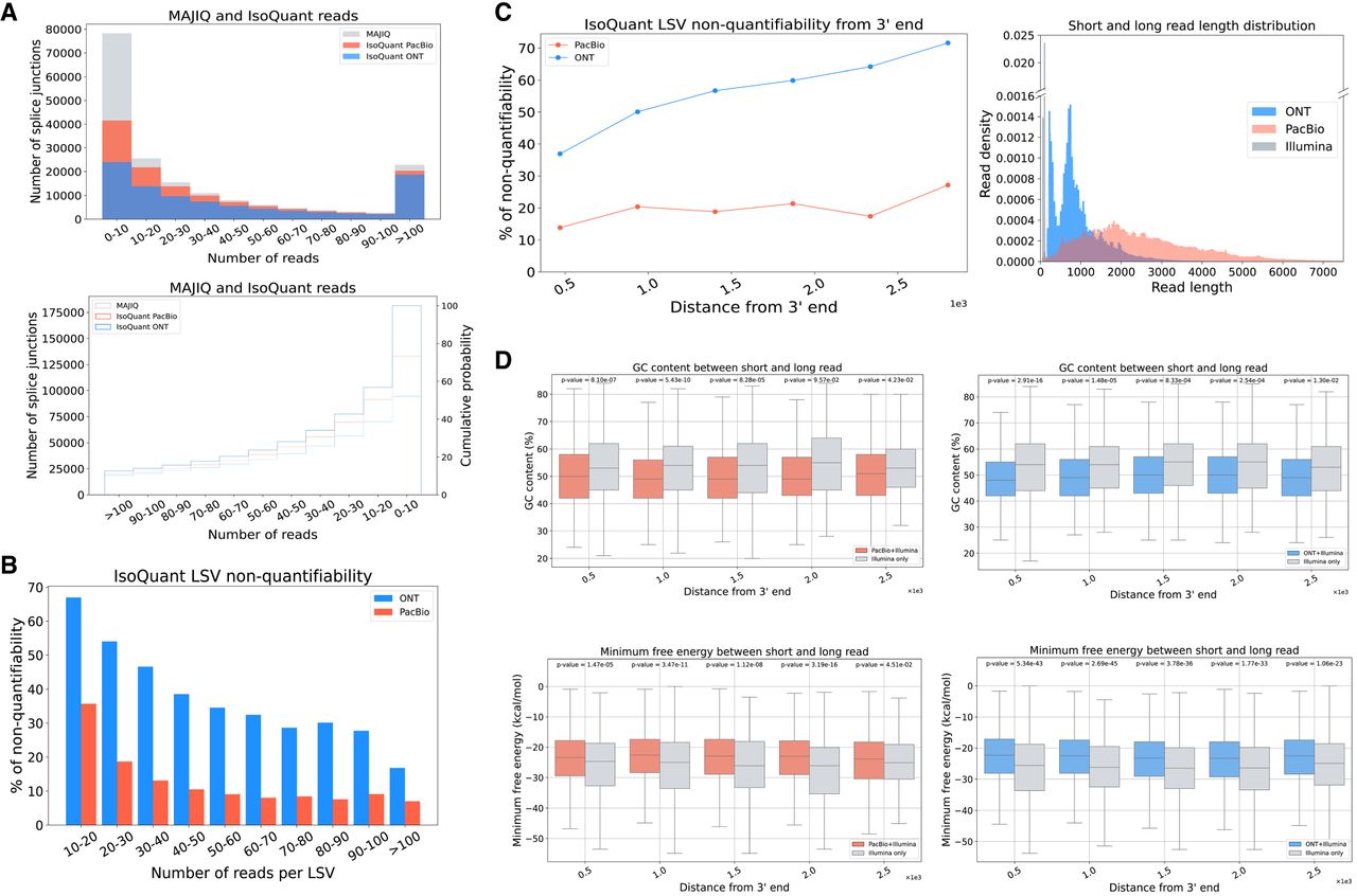 Analysis of sources of discrepancy between short- and long-read-based transcriptome variations. (A) The number of MAJIQ's splice junctions (gray) identified by IsoQuant using PacBio (red) or ONT (blue) as a function of the number of short reads covering the junctions. The histogram on the top and CDF on the bottom show the number of splice junctions (y-axis) as a function of read number (x-axis). (B) Bar plots showing the fraction of LSV reported by MAJIQ's short-read analysis, which were “nonquantifiable” by IsoQuant using PacBio-matched (orange) and ONT-matched (light blue) long-read data. Here a “quantifiable” LSV require at least 10 reads covering its respective junctions. Of note, a substantial fraction of LSV remain unquantifiable by long reads even for those with extremely high short-read coverage (more than 100 reads). (C) Same plot as in B for the fraction of nonquantifiable LSVs by long-read data, but here as a function of distance from transcript 3′ end. When LSV involved transcripts with multiple 3′ ends, the shortest distance was used as a conservative estimate. The length distribution of short and long reads in the LRGASP data set was used in all the above subfigures. (D) Boxplots showing GC content and minimum free energy (MFE) across various distances from the transcript 3′-end for junctions with more than 40 Illumina reads in A that are only detected by short reads (gray) or are also detected by long reads (red, PacBio; blue, ONT). Each boxplot represents the GC content and MFE (y-axis) as a function of the distance from 3′-end (x-axis). The median is denoted by the horizontal line in each box, the upper and lower quartiles are denoted by the box, and the whiskers show points that lie within 1.5 IQRs of the lower and upper quartiles. P-values were calculated using the Mann–Whitney U-test. Note that A–D are averaged across the three LRGASP data replicates.