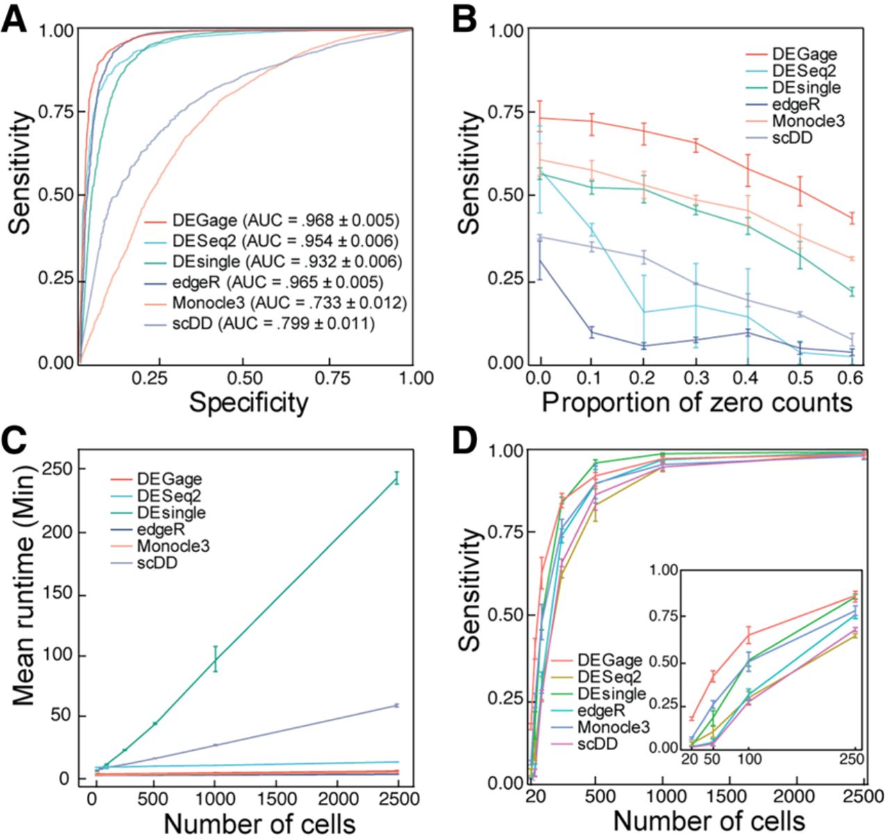Computational performance of DEGage. (A) ROCs show the performances of six methods on simulated data. (B) The effect of dropout proportions on the sensitivities of the six methods. (C) Runtimes of each method with varying numbers of cells. (D) Sensitivities of each method with different numbers of cells.