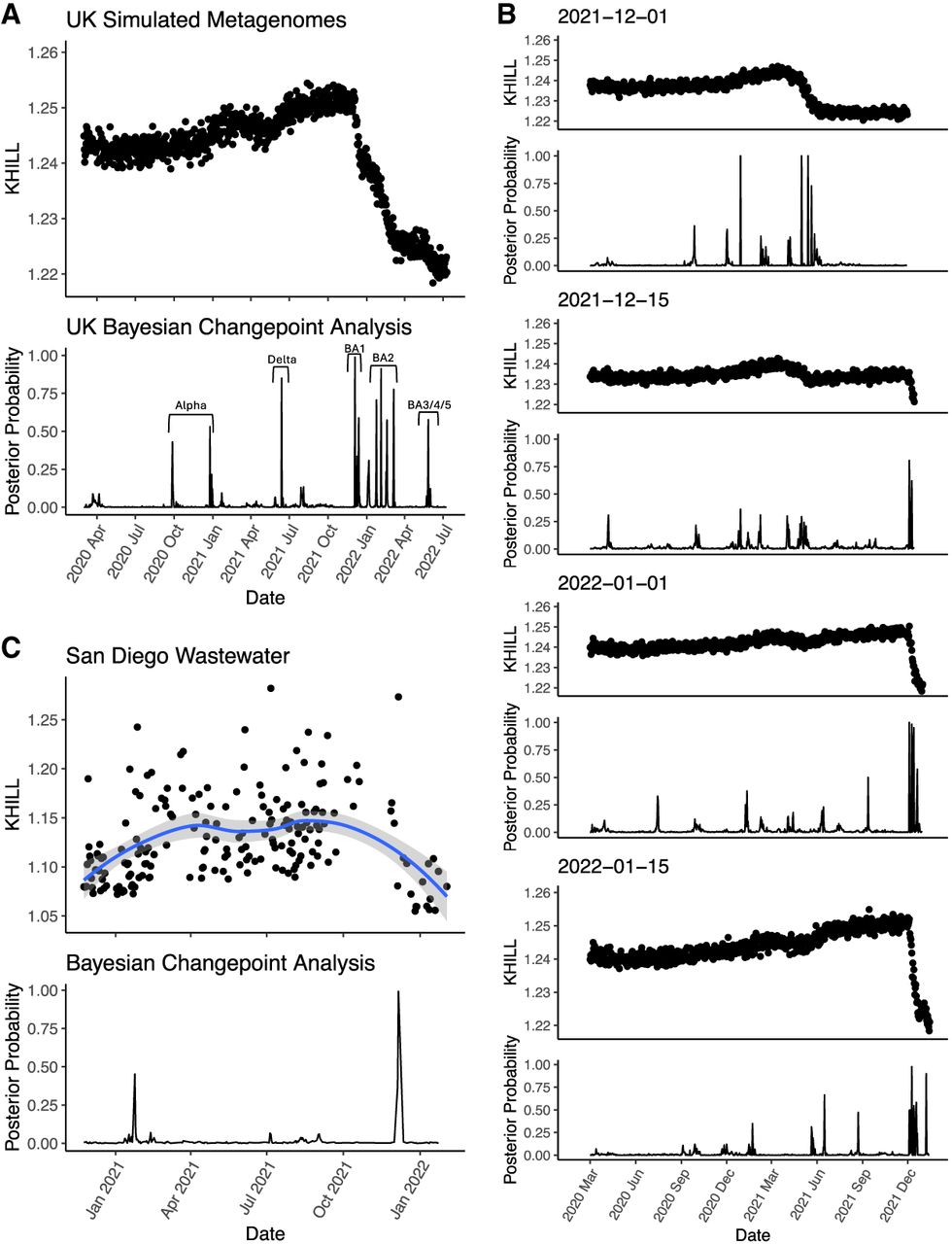 SARS-CoV-2 in raw, pooled sequence. We show pairwise comparisons of the simulated survey sequence from July 11, 2022 to the simulated survey sequence from all prior days during the course of the UK pandemic. This autocorrelation analysis shows a pronounced downward swing marking the turnover from Delta to Omicron. The shadows of previous transitions are also evident in the KHILL trace. We show that these transitions are significant using Bayesian Changepoint Detection and annotate each transition with its emerging variant (A). To demonstrate how this technique can be used in real time, we compare simulated survey sequence from four-time points chosen to track the arrival of Omicron. As Omicron suffuses the population, we can see the KHILL curve plunge with respect to time points dominated by Delta (B). San Diego wastewater data show similar—albeit noisier—transitions between variants. Comparison of raw sequence from a day dominated by Omicron to all prior days shows clear and significant separation between Alpha/Epsilon and Delta/Omicron (C).