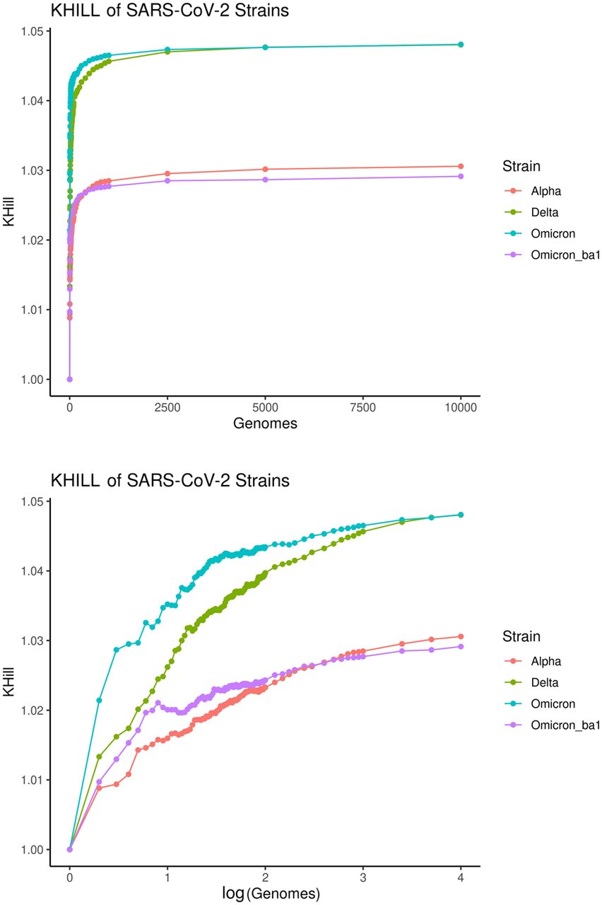 SARS-CoV-2 comparative genomics. We randomly sampled 10,000 Alpha, Delta, and Omicron genomes from the UK pandemic. As we randomly accumulate genomes, information diversity accrues. We show that Delta and Omicron converge on similar information diversity, but that Delta is more complex. Both are far more diverse than either Alpha or Omicron BA1 alone, an observation confirmed by phylogenetic methods on far fewer genomes.