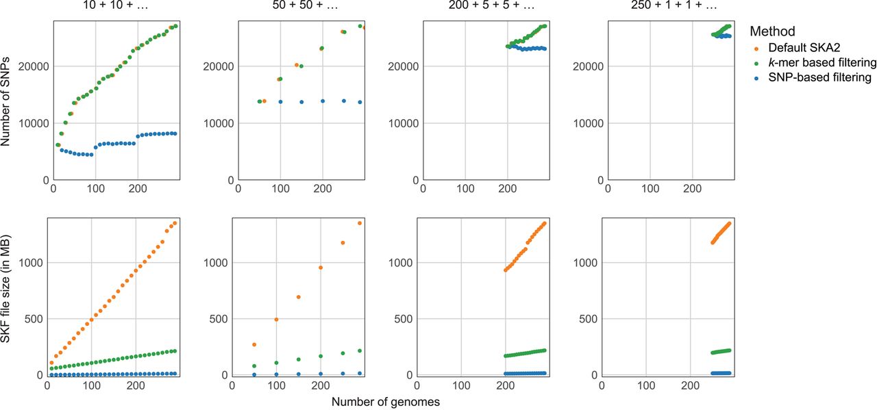 Online analyses of E.coli genomes. The three different genome addition strategies mentioned in the main text are displayed from left to right. Units of the x-axes (number of genomes) are identical across the six plots, and units of the y-axes (number of SNPs and SKF sizes) are identical within plots on the same line. “k-mer-based filtering” refers to the filtering based on missing split-k-mers, and “SNP-based filtering” refers to the filtering based on presence-absence of SNPs. Points corresponding to the number of SNPs (upper panels) obtained from default SKA2 analyses and after k-mer-based filtering were jittered to avoid overlapping.