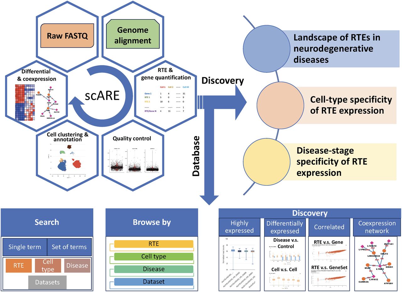 An overview of the single-cell atlas of retrotransposable elements in neurodegenerative disease (scARE) framework: pipeline, analysis, and web portal. The retrieved single-cell transcriptome profiles underwent systematic processing via a customized pipeline, followed by analysis focusing on three aspects: the landscape of retrotransposable elements (RTEs) in neurodegenerative diseases, their cell type specificity, and disease specificity (discovery component). The scARE database provides search and browse options, along with six analytical modules, including highly expressed RTEs, differential expression between disease conditions, differential expression between cell types, correlated expression between RTE and gene, correlated expression between RTE and gene list, and coexpression networks.