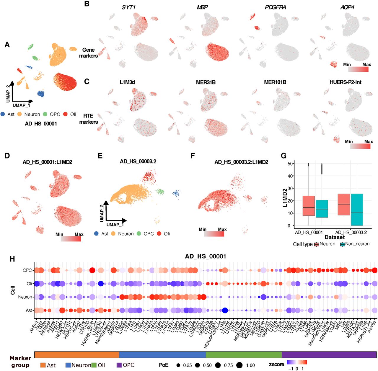 Cellular heterogeneity of RTEs. (A) Uniform manifold approximation and projection (UMAP) plot of cells in normal patients in data set AD_HS_00001 colored by cell type. Excitatory and inhibitory neurons were combined as neurons. (Ast) Astrocytes, (Oli) oligodendrocytes, (OPC) oligodendrocyte precursor cells. (B) Examples of well-known gene markers of neurons, Oli, OPCs, and Ast. Colors represent the expression of genes in the corresponding cell types. (C) RTE markers identified in this study for neurons, Oli, OPCs, and Ast. (D) Expression of L1MD2 in AD_HS_00001. (E) UMAP of cells in normal individuals in data set AD_HS_00003.2, colored by cell type. (F) Expression of L1MD2 in data set AD_HS_00003.2. (G) Boxplot of expression of L1MD2 in data sets AD_HS_00001 and AD_HS_00003.2. Color represents cell type (neurons vs. nonneurons). (H) Dot plot showing signature RTE expression and percentage of cells for neurons, OPCs, Oli, and Ast in the data set AD_HS_00001.