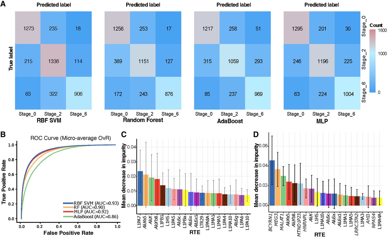 RTE expression profile predicts the disease stage using machine learning algorithms. (A) Confusion matrix for predicting the disease-stage label of excitatory neurons using RTE expression profile by radial basis function kernel support vector machine (RBF SVM), random forest (RF), adaptive boosting (AdaBoost), and multiple layer perceptron (MLP). (B) Tenfold cross-validation receiver operating characteristic (ROC) curve for predicting the disease-stage label of excitatory neurons using RTE expression profile by RBF SVM, RF, MLP, and AdaBoost. (C) Feature importance extracted from the RF model in A. (D) Feature importance extracted from the RF model built with a combination of RTE and gene expression selected by recursive feature elimination (RFE). Only excitatory neurons were considered in this figure.