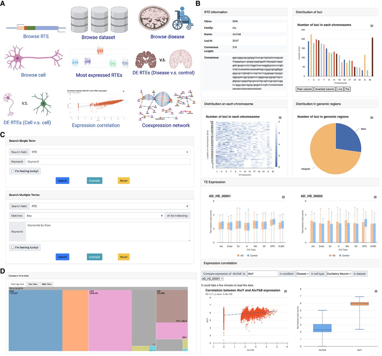scARE for exploration of RTE information and heterogeneity in three neurodegenerative diseases. (A) The home page of scARE displays prompt access to the major functions. (B) RTE view of the scARE. It contains seven major components: basic information, distribution of loci across chromosomes, distribution of loci within each chromosome, distribution of loci in different genomic regions, mean expression across data sets, and analytical module of expression correlation. (C) The search page of the scARE. Users can search for RTEs by using single or multiple terms in the fields of RTE, gene, data set, and disease. (D) Browse by RTE options. Four different options to browse RTEs by “RTE,” “cell type,” “disease,” and “data set.”
