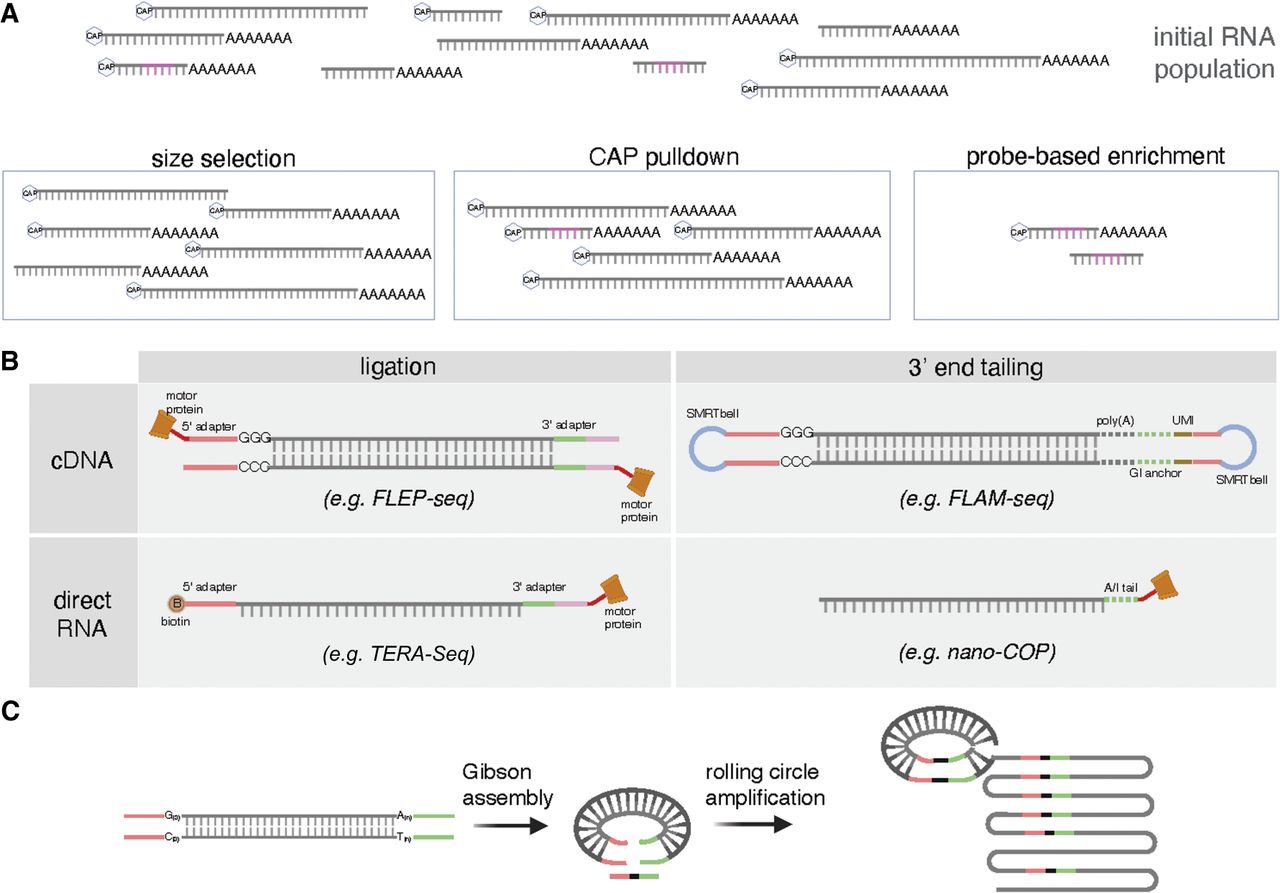 Experimental strategies to enrich for full-length RNA molecules in LRS data. (A) Methods that specifically enrich for 5′ ends or full-length molecules (based on size or sequence) can be used to increase the chances of sequencing full-length mRNAs. (B) Methods that add known sequences to the terminal ends of mRNAs by ligation (left) or tailing (right) are an unbiased way to recognize full-length molecules in both cDNA (top) and directRNA (bottom) sequencing. (C) Circularization of mRNAs or cDNAs during library preparation allows for multiple rounds of terminal adapter and target molecule sequencing.