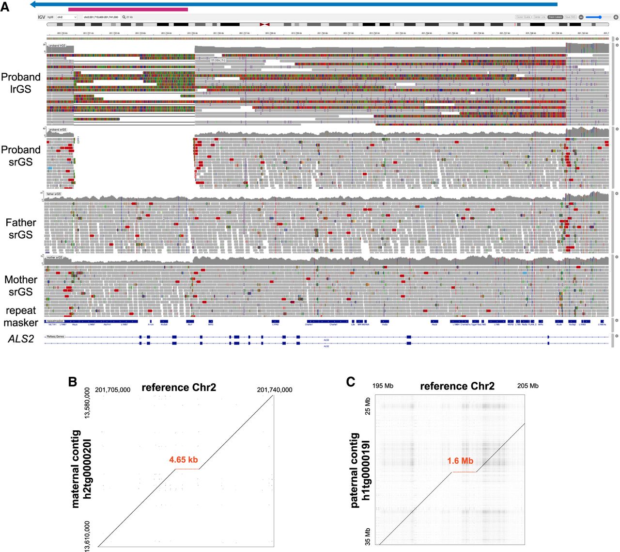 Two ALS2 deletions in trans in proband 2. (A) Visualization of proband and parent reads in IGV (Chr 2:201,719,400–201,741,000) indicate two overlapping deletions in ALS2; a smaller maternal deletion (pink bar) and a larger paternal deletion (blue bar/arrow). Note that the three breakpoints shown here overlap Alu sequence in the RepeatMasker track. Alignment of the proband's assembled maternal (B) or paternal contig (C) versus the reference genome supports the two deletions (red dashed lines).