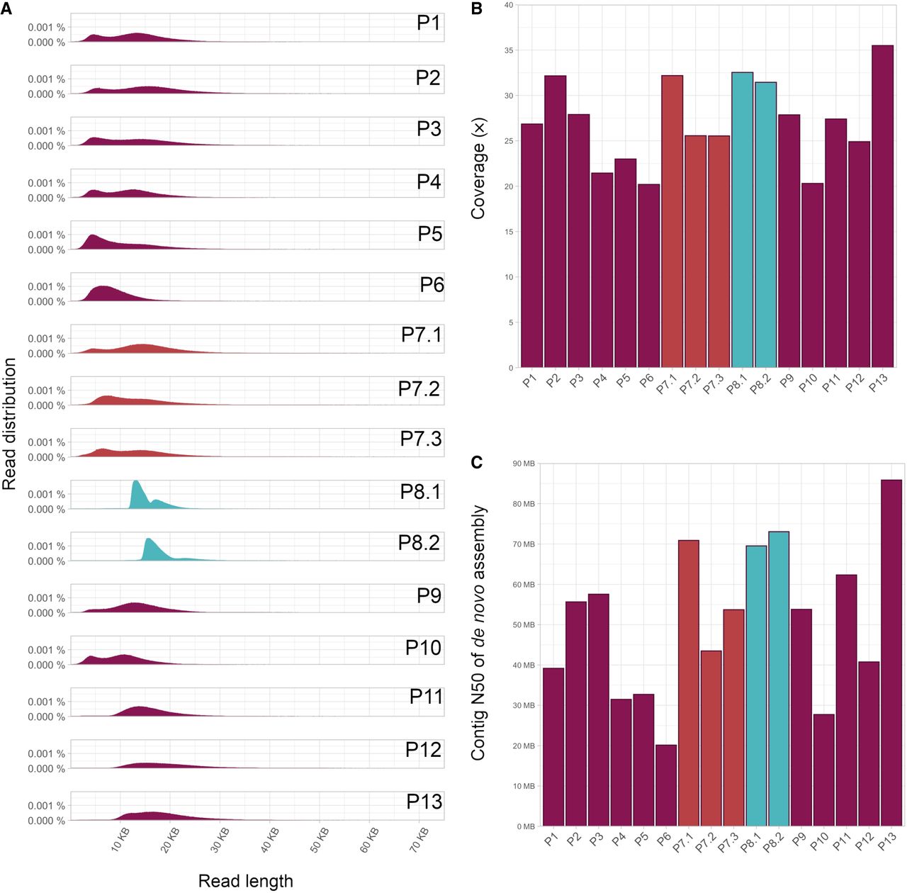 Quality measures of lrGS. (A) Read length distribution, (B) coverage, and (C) N50 of de novo assembly.