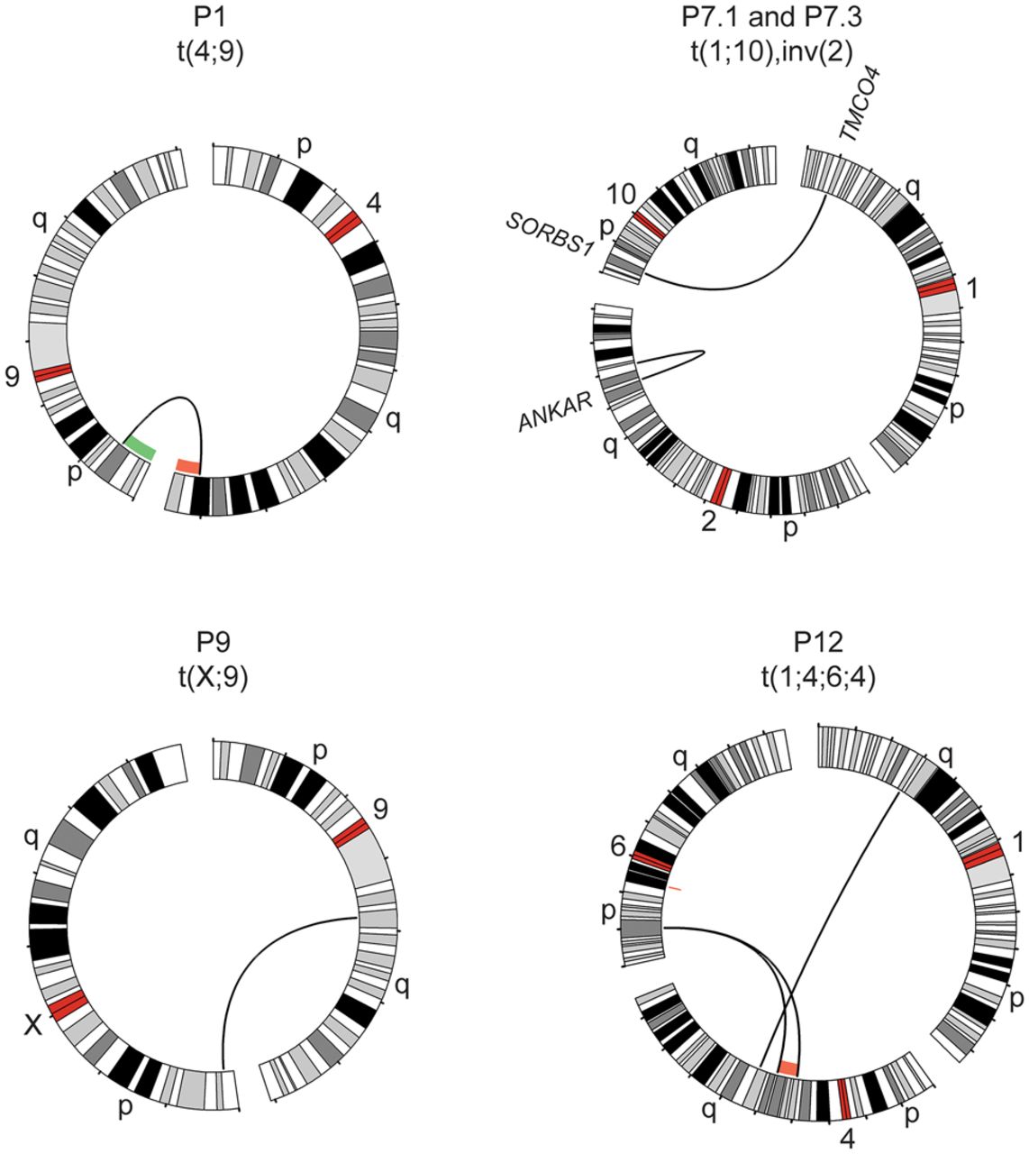 Translocations and inversions identified with lrGS. Circos plots of rearrangements detected in four cases using lrGS: a t(4;9) in P1, a t(1;10) and inv(2) (P7.1 and P7.3), a t(X;9) (P9), and a t(1;4;6;4) (P12). A green/red line indicates copy number gain/loss, respectively. Genes disrupted are indicated at the breakpoint.