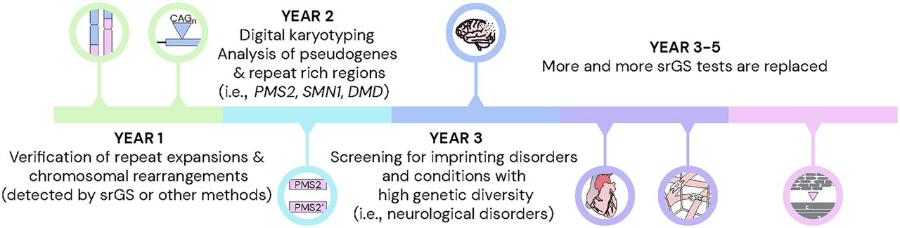 Toward lrGS as a first tier diagnostic test in rare disease. A 5-year time line with the expected development of long-read sequencing in the clinical setting.